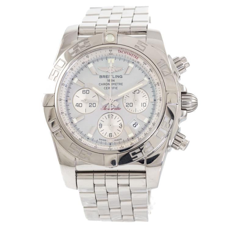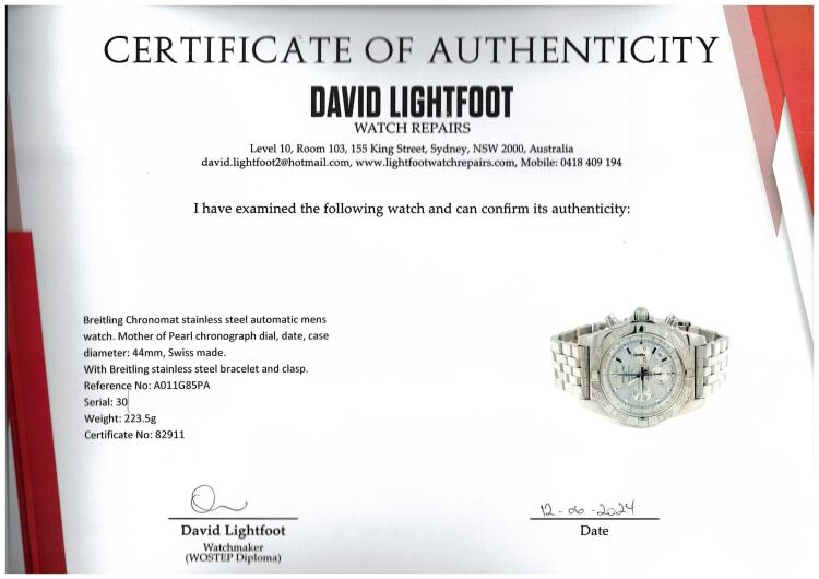 Breitling Chronomat stainless steel automatic mens watch. Mother of Pearl chronograph dial, date, case diameter: 44mm, wrist size: 20cm, Swiss made. Ref# A011G85PA. With Breitling stainless steel bracelet and clasp. With Certificate of Authenticity, Breitling International Warranty booklet dated 23/08/2011 and Breitling box. 3 month FSA warranty. (Pre-owned)