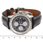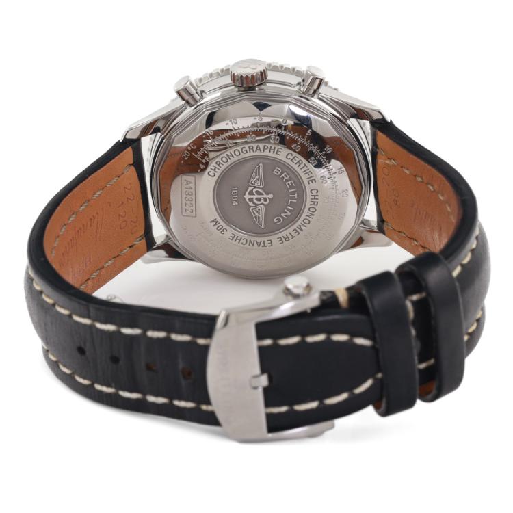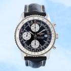 Breitling Old Navitimer stainless steel automatic mens watch. Black chronograph dial, date, case diameter: 41mm, adjustable maximum wrist size: 19.5m, Swiss made. Ref# A13322. With Breitling black leather strap and clasp. With Certificate of Authenticity and Breitling box. 3 month FSA warranty. (Pre-owned)