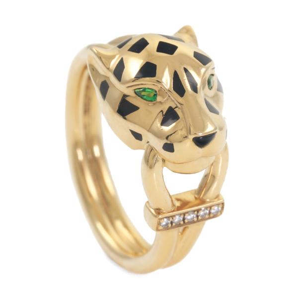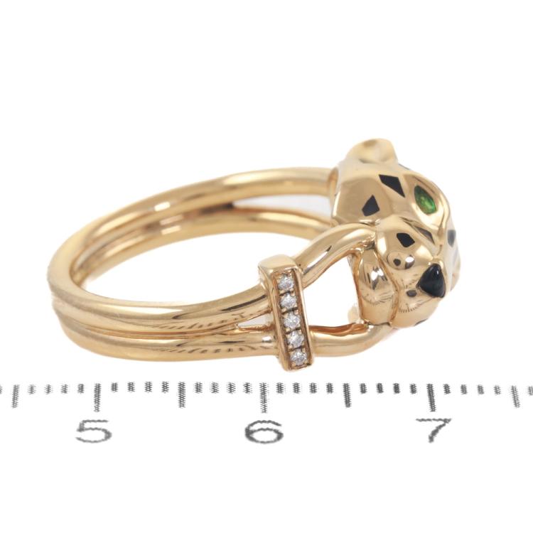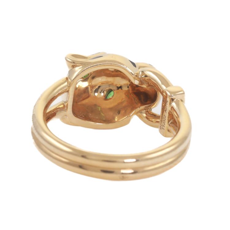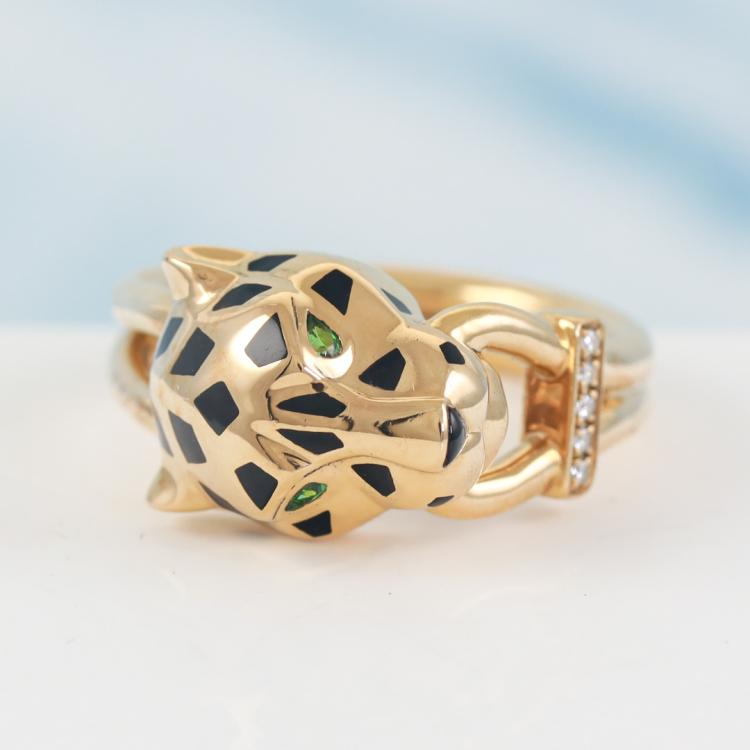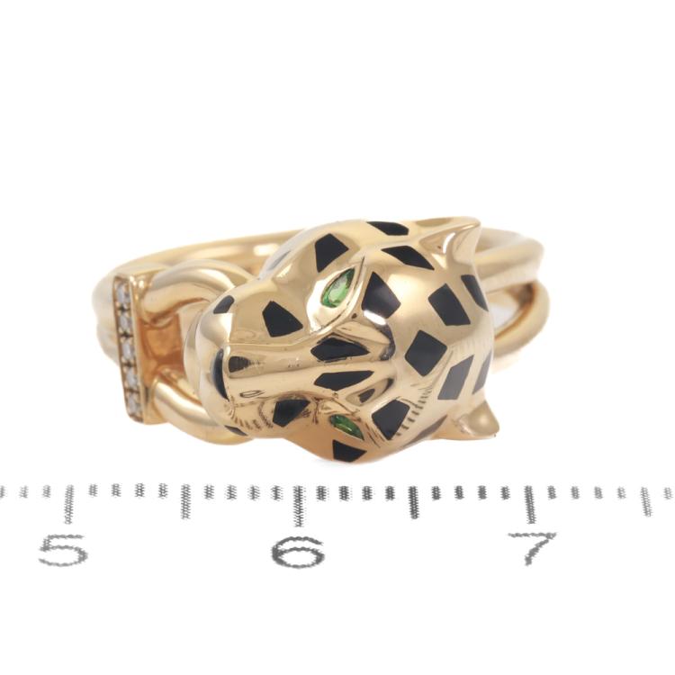 Cartier Panthere De Cartier ring with 5 round Natural Diamonds totalling 0.02ct, 2 pear shape Natural Tsavorite Garnets totalling approximately size 2mm x 1.1mm and black lacquer. 18ct yellow gold. Stamped size 54, M1/2 - ring resizing is not recommended. Band width: 3.6mm. Weight: 9.6g. With Cartier box and Certificate and copy of Cartier receipt. (Pre-owned)
