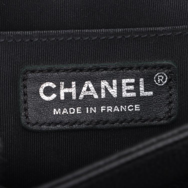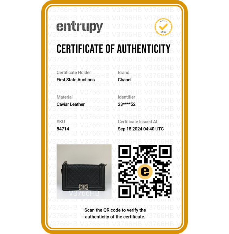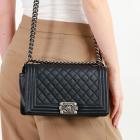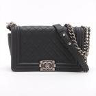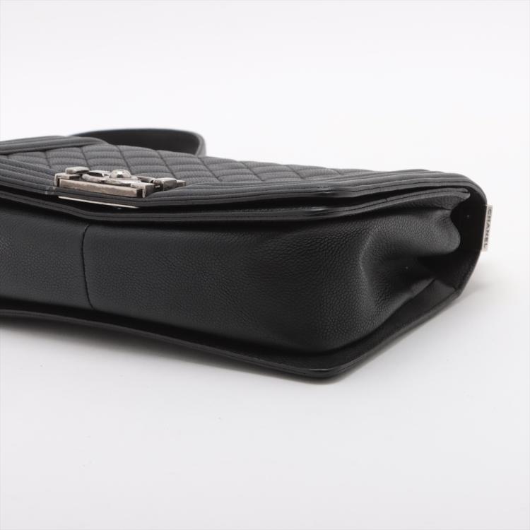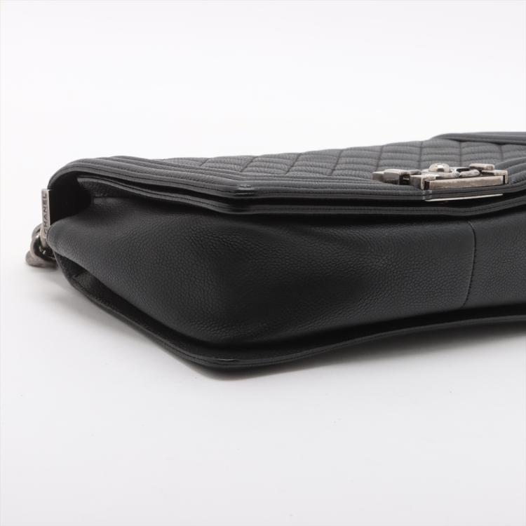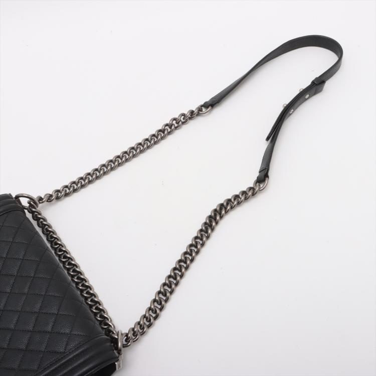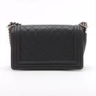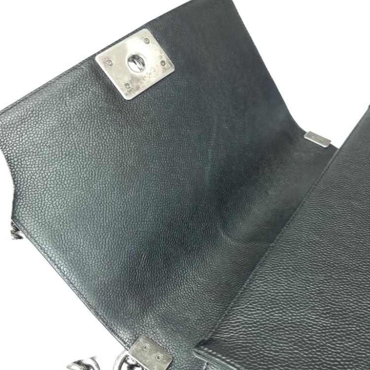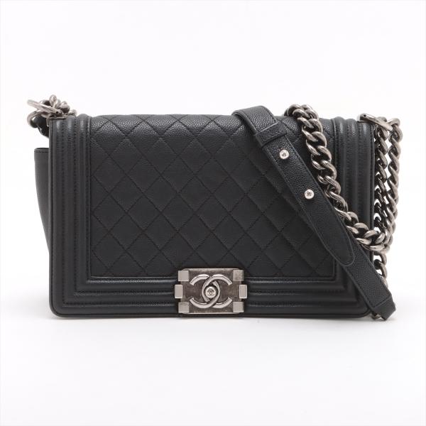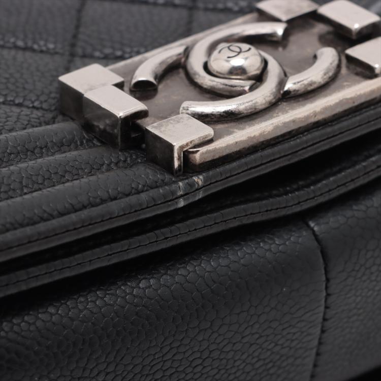 Chanel medium boy flap bag in diamond quilted black Caviar skin leather with a linear quilted border (Serial#23xxxx52). Featuring metal silver-toned hardware, frontal flap with Chanel boy logo press-lock closure. It opens to a black fabric lining interior with a patch pocket. Approximate dimensions: 25cm(L) x 14.5cm(H) x 7.5cm(D), 55cm shoulder leather-chain drop. With Entrupy Certificate of Authenticity. (Pre-owned)