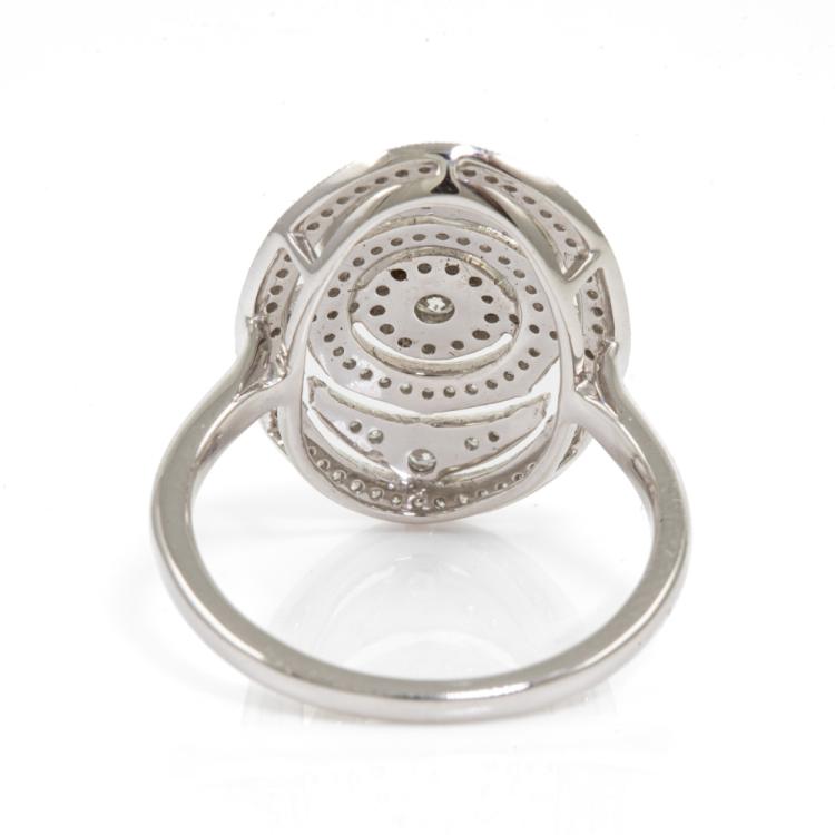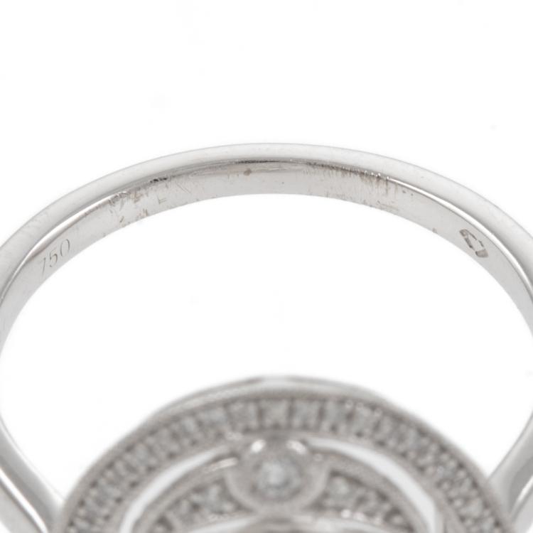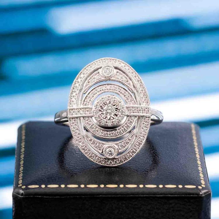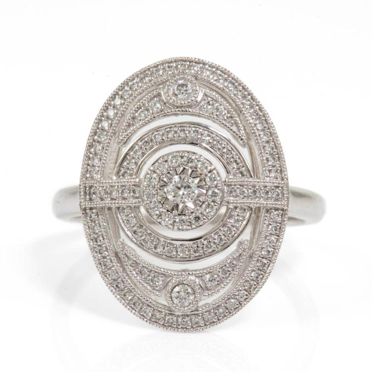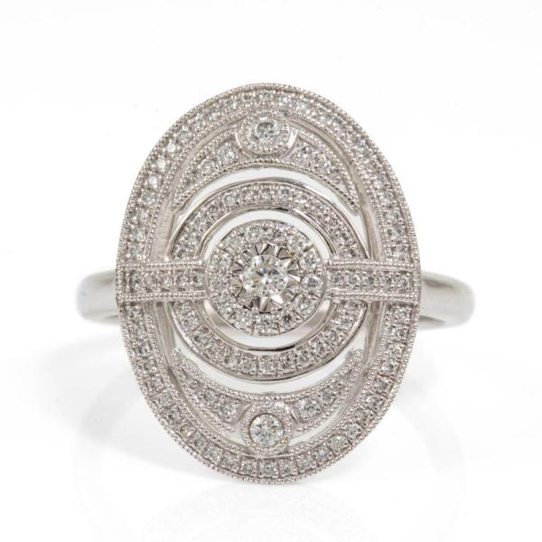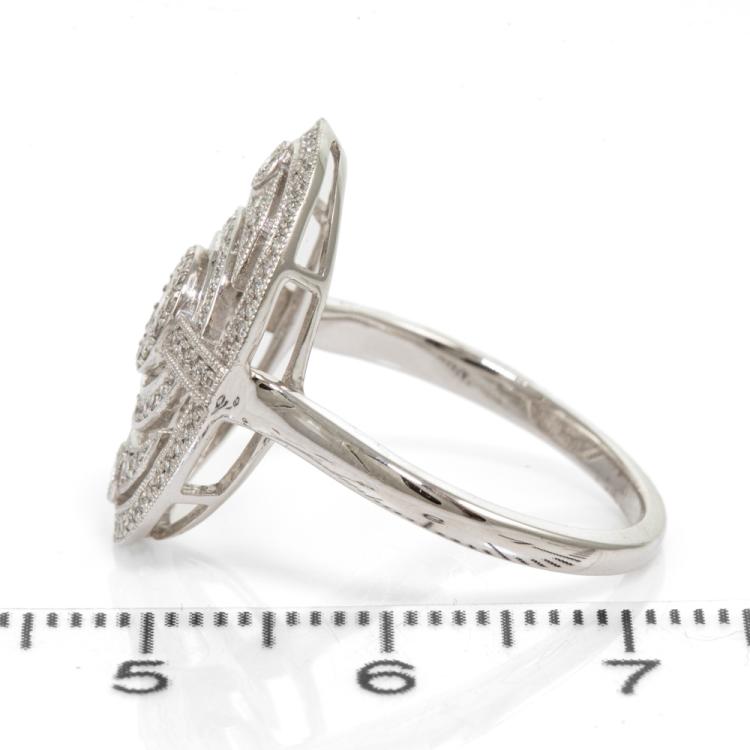 Diamond Art Deco style dress ring with round Natural Diamonds totalling 0.40ct (Estimated grading: G-H SI). 18ct white gold. Ring size O. Band width: 1.7mm. Weight: 5.3g. With scratches inside ring band. (As New)