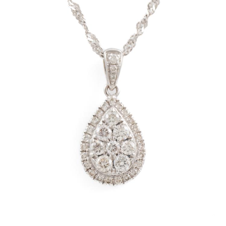 Angus and Coote Diamond pending and Earrings set. Diamond pending with round Diamonds totalling 0.44cts (Estimated grading: H-J VS-P1), 9ct white gold with 41cm 18ct white gold chain, weight: 3.0g. And matching earrings with round Diamonds totalling 0.57cts (Estimated grading: H-J SI-P1), 9ct white gold, weight: 1.6g. Total weight: 4.6g. With copy of GSL Report #AA63604/2. (Pre-owned)^