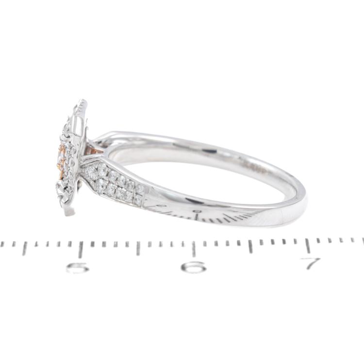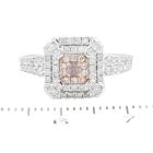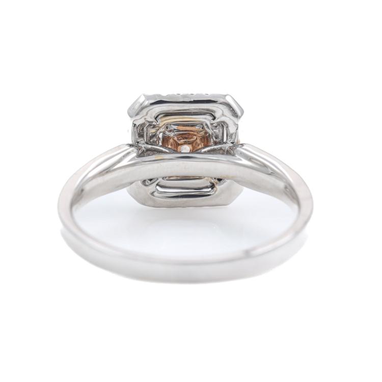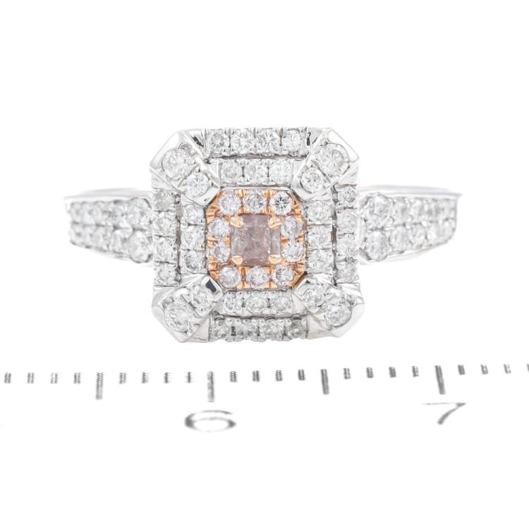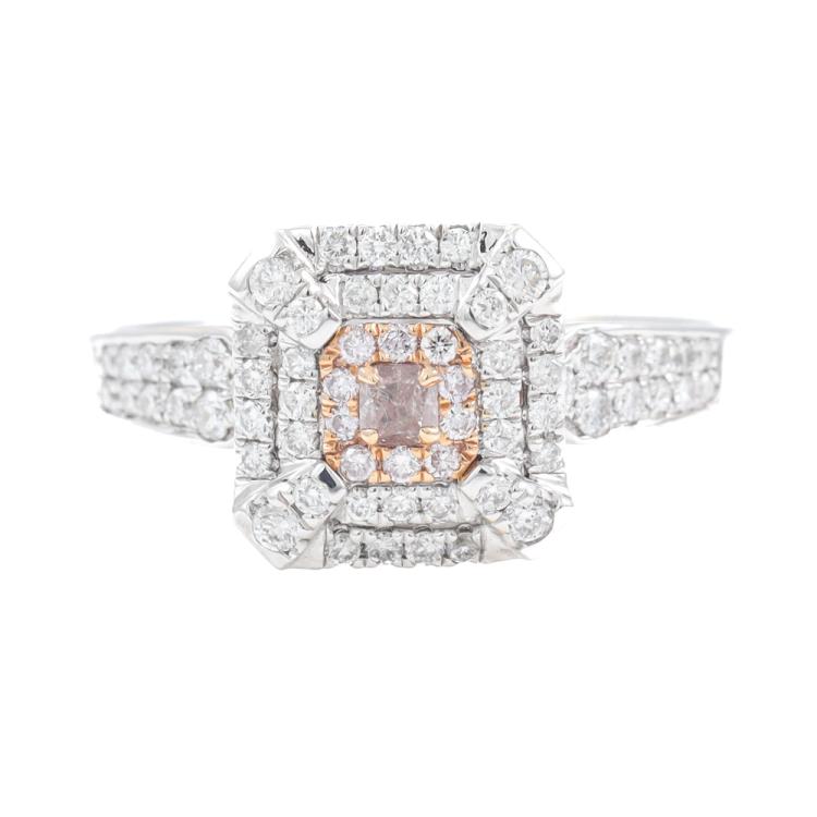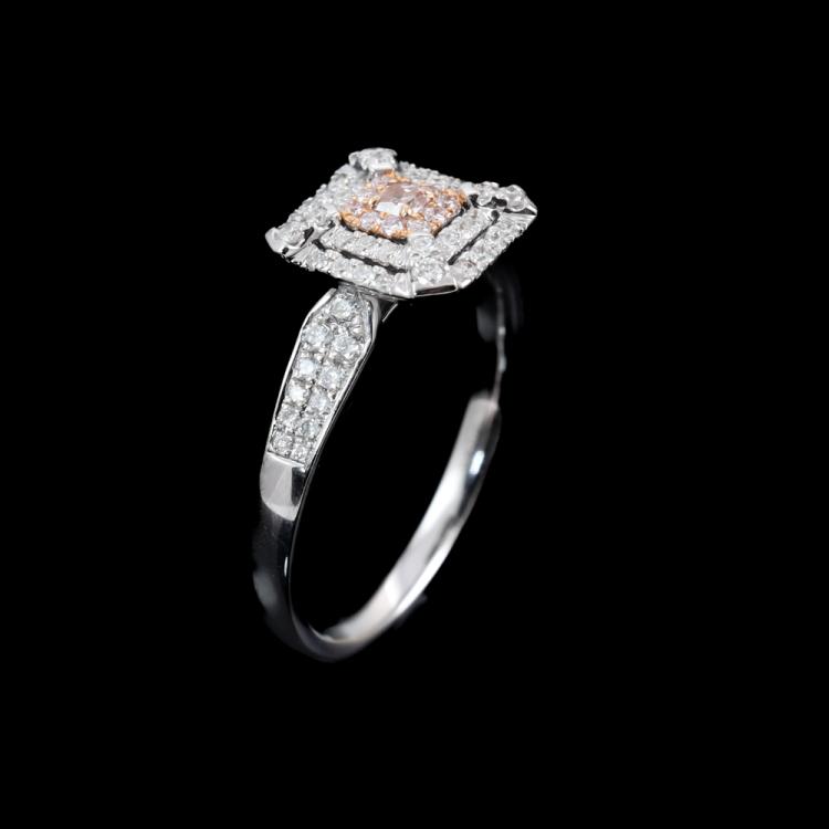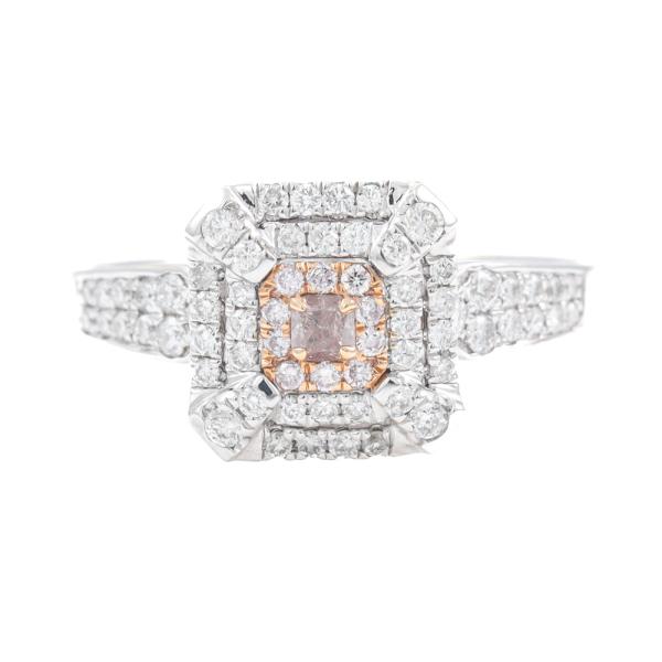 Diamond dress ring with centre square cushion cut Natural Pink Diamonds of 0.07ct and remaining round pink & white Natural Diamonds totalling 0.41ct (Estimated grading: Light Pink & H-I SI). 18ct rose and white gold. Ring size N. Band Width: 1.9mm - 2.5mm. Weight: 3.5g. (As new)