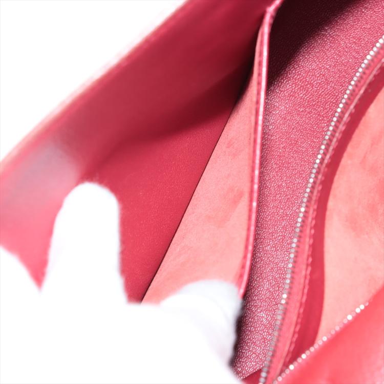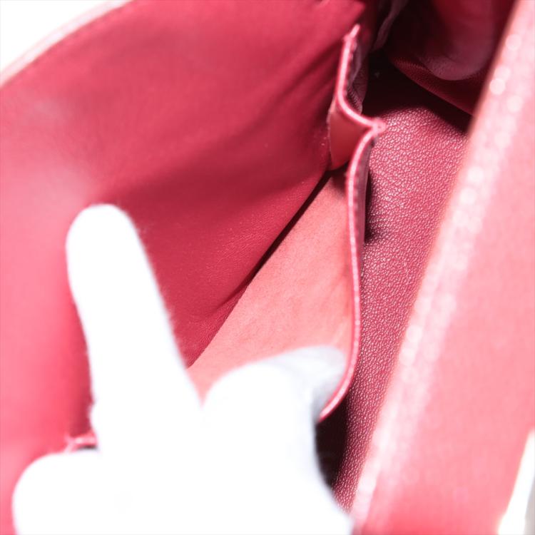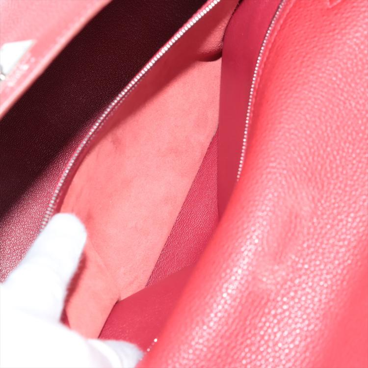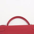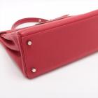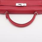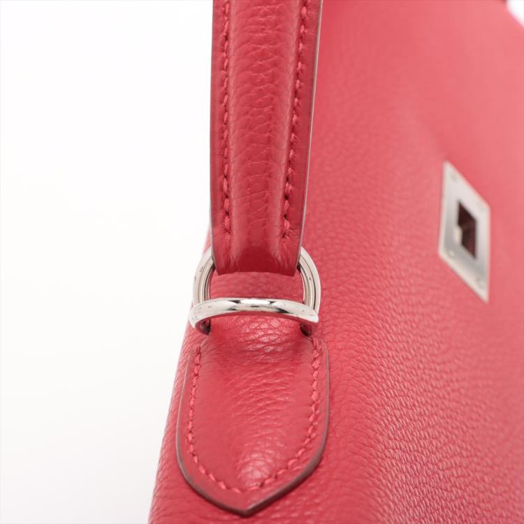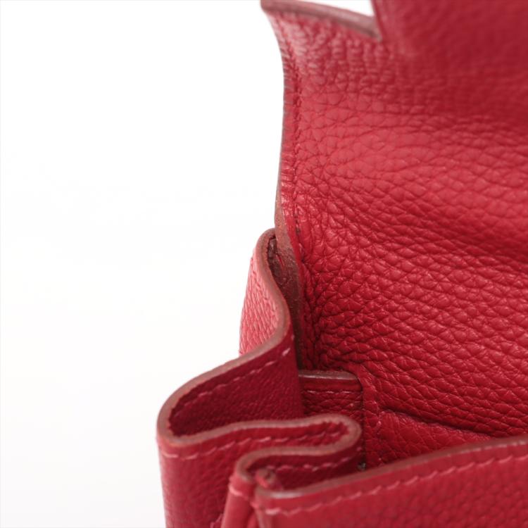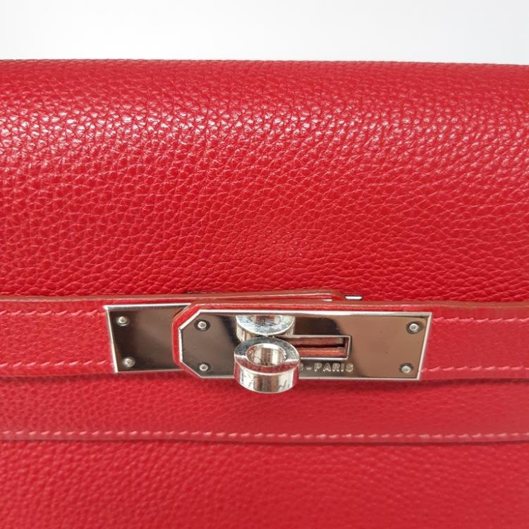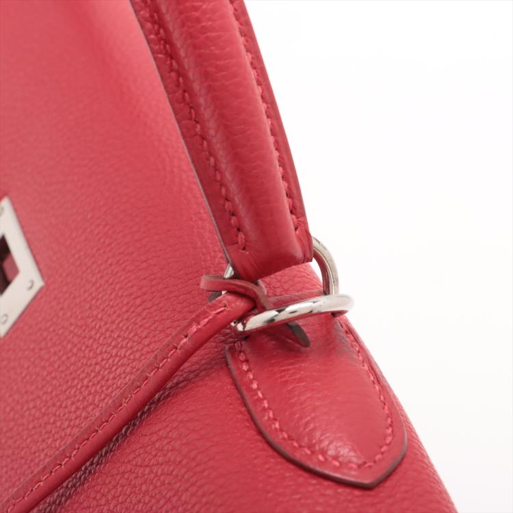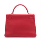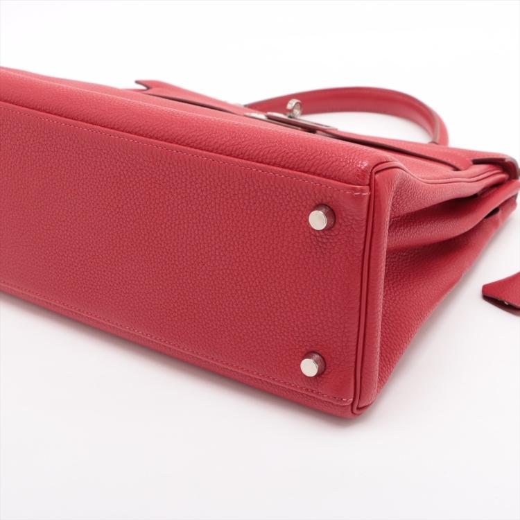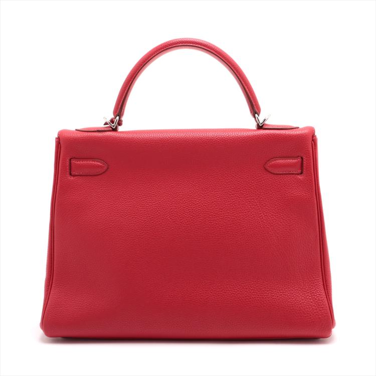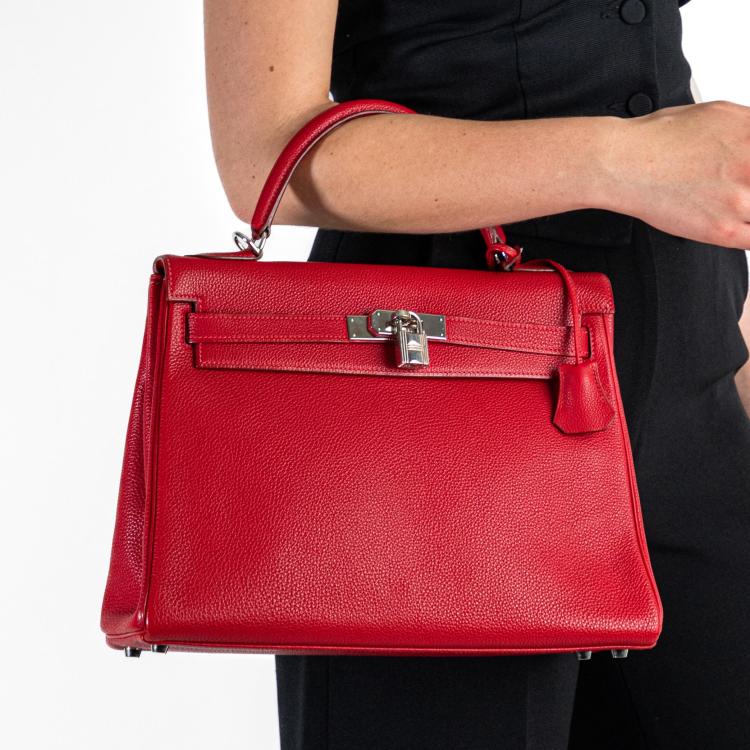 Hermes Kelly 32 bag in Rouge Togo leather (Square F, 2002) with silver-toned hardware, Featuring leather top handle, frontal flap, straps and a turn lock closure. The flap opens to a matte matching colour leather interior with zipped and flat pockets. Approximate dimensions: 32cm(L) x 22.5cm(H) x 12.5cm(D), handle drop 9.5cm. Accompanied by a leather clochette, padlock, keys. NOTE: Shoulder strap NOT included. With Entrupy Certificate of Authenticity. (Pre-owned)