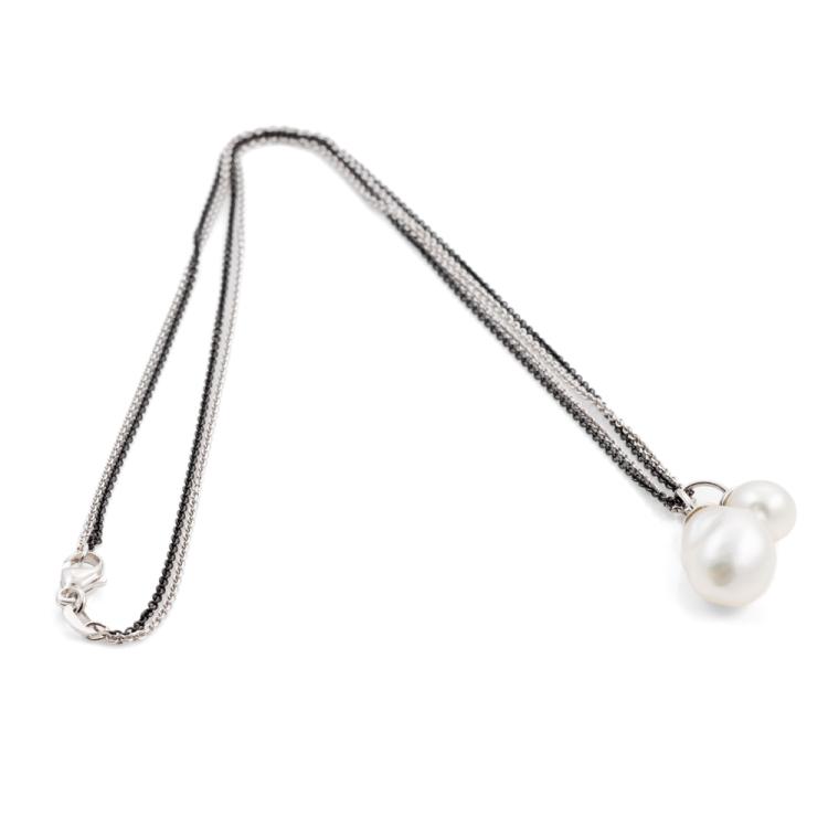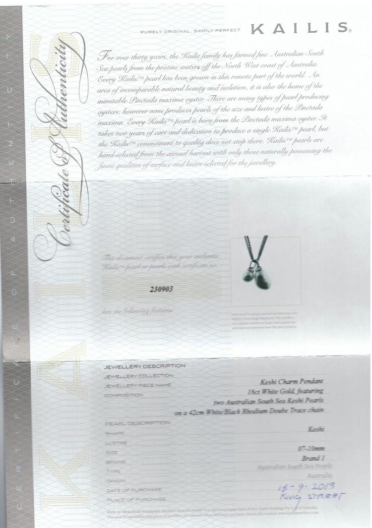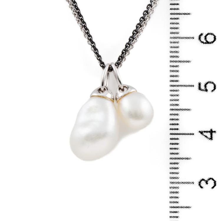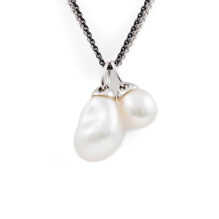 Kailis Pearl pendant with 2 Australian Keshi South Sea Pearls of sizes approximately 13.5 x 9.7 x 8.2mm and 9.2 x 7.1 x 7.0mm. 18ct white gold with 42cm 18ct white gold and black rhodium double trace chain. Weight: 7.2g. With Kailis Certificate of Authenticity #230903. (Pre-owned)