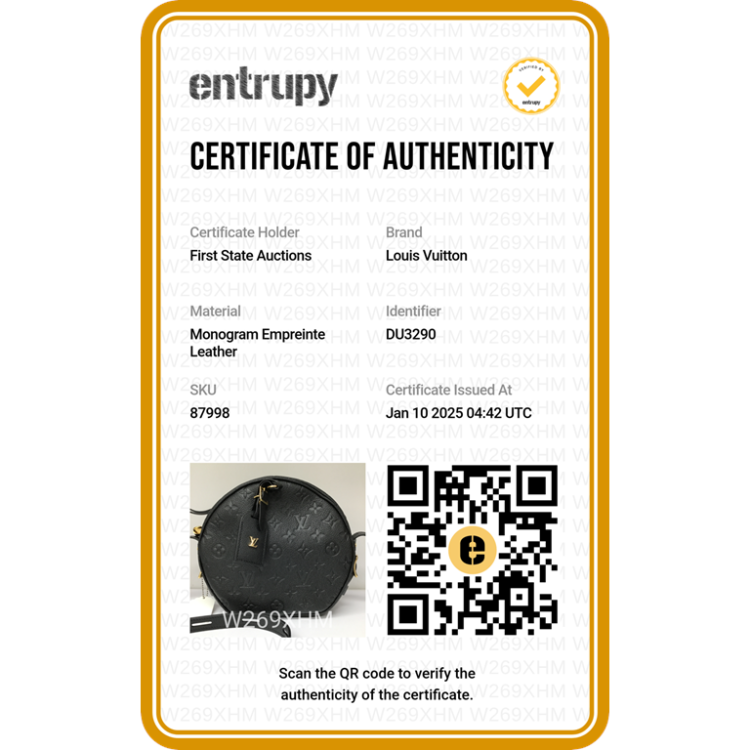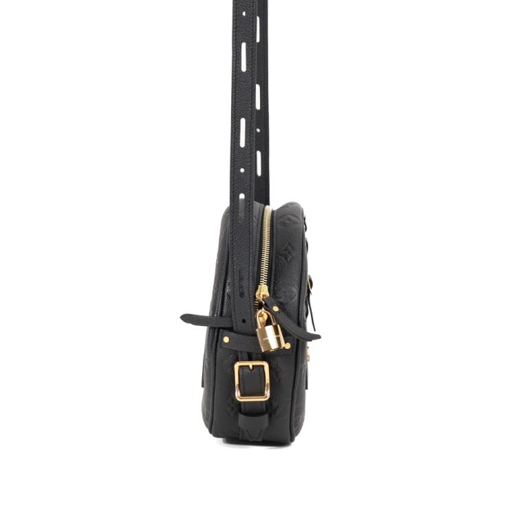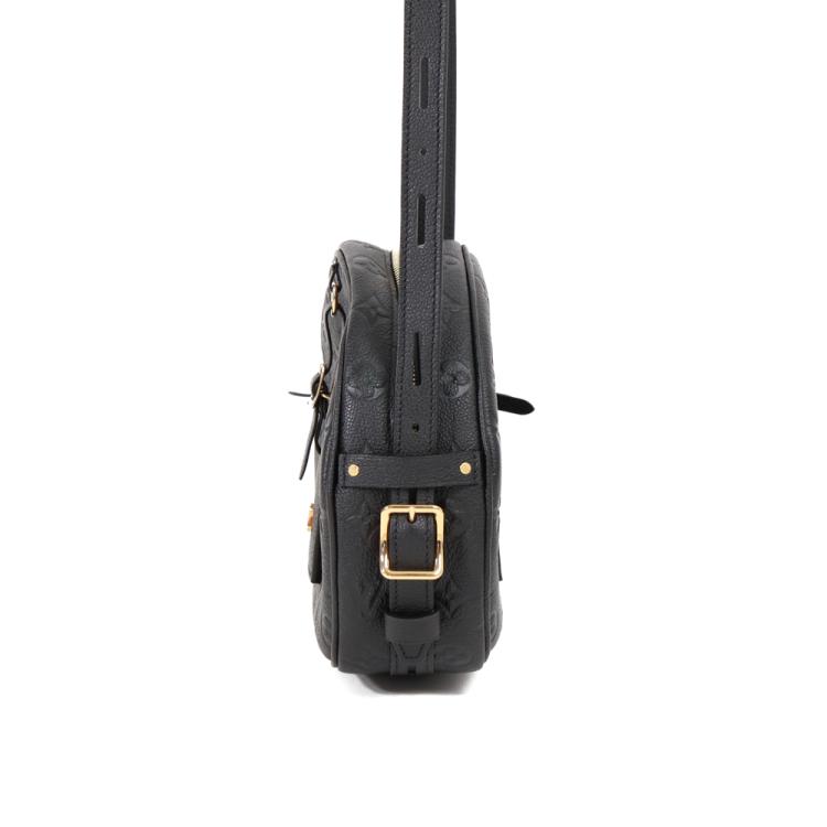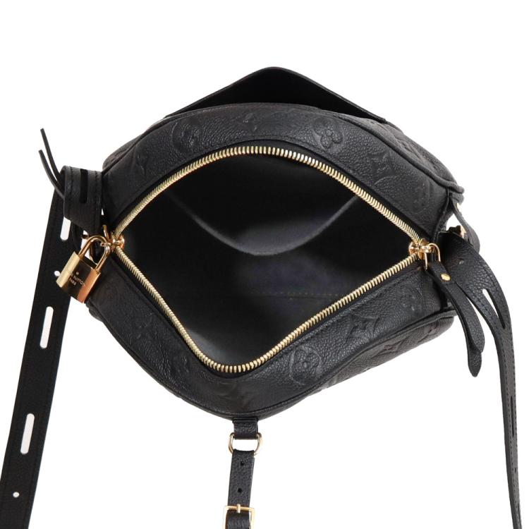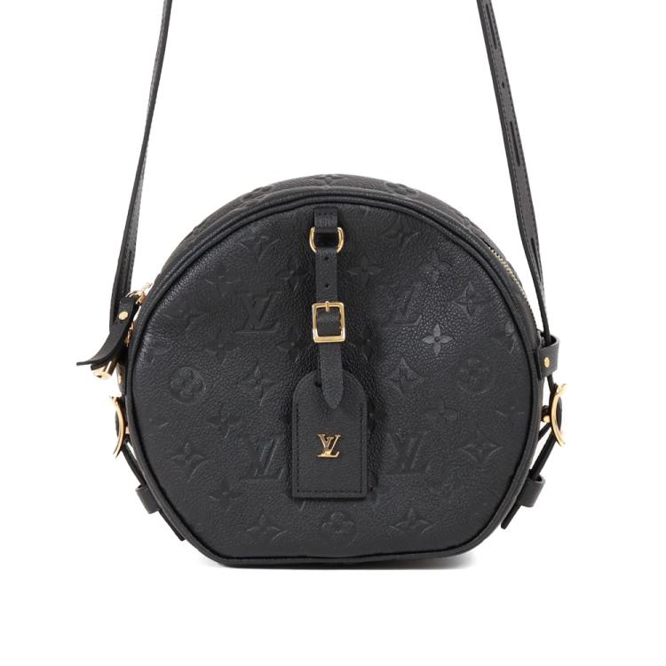 Louis Vuitton Boite Chapeau Souple MM in black Monogram embossed Empreinte leather. Featuring gold-tone hardware, a leather luggage tag at front, an exterior flat pocket at back, 2 side, and a leather shoulder strap. The top zipper opens to black microfiber lining interior with a patched pocket. Approx dimensions: 22.5cm(L) x 20cm(H) x 8cm(D), strap drop: 21cm-48cm. Accompanied by LV padlock. Note: Keys NOT included. With Entrupy Certificate of Authenticity. (Pre-owned)