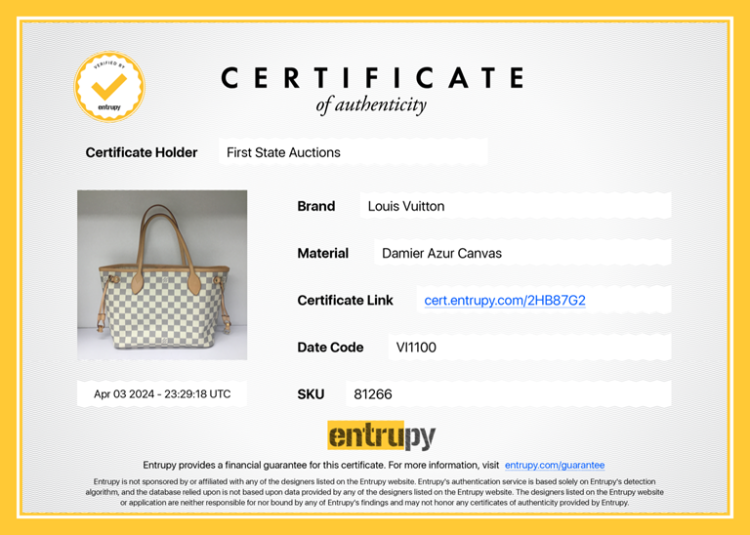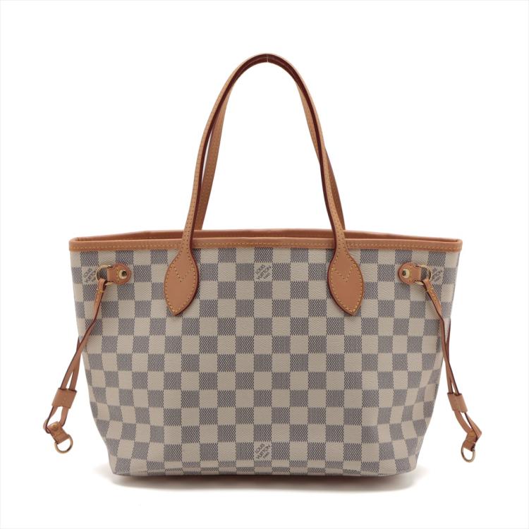 Louis Vuitton Neverfull PM in Damier Azure coated canvas. Featuring brown leather trim, 4 side laces and handles, gold-toned hardware, hook closure. The top opens to ivory striped textile lined interior with a hanging zipped pocket. Approximate dimensions: 28cm(L) x 22cm(H) x 12.5cm(D), 16cm handle drop. With Entrupy Certificate of Authenticity. (Pre-owned)