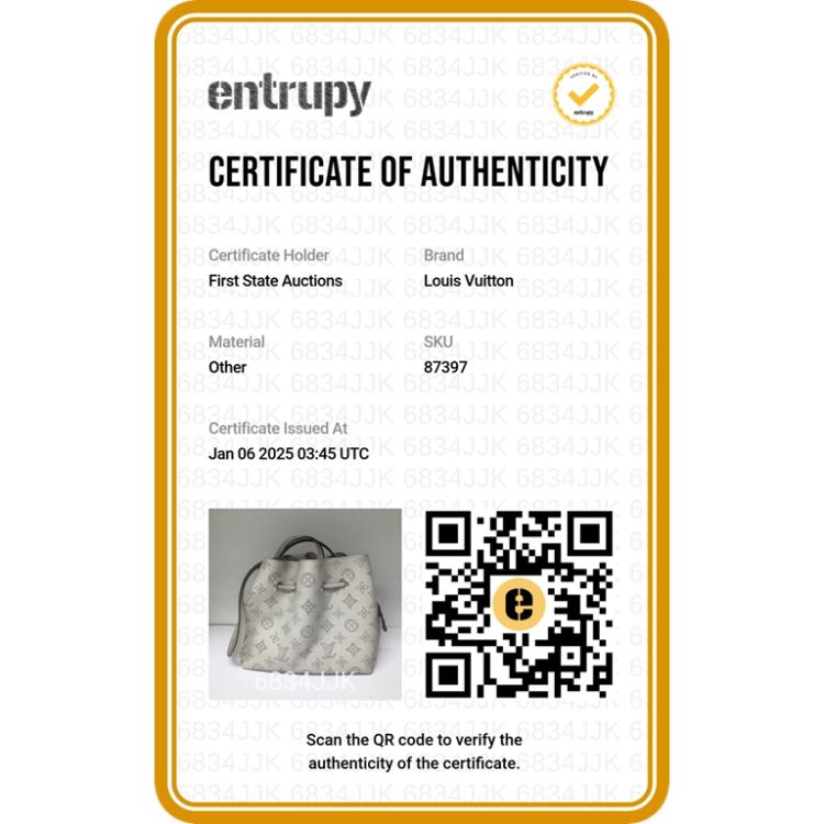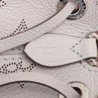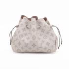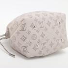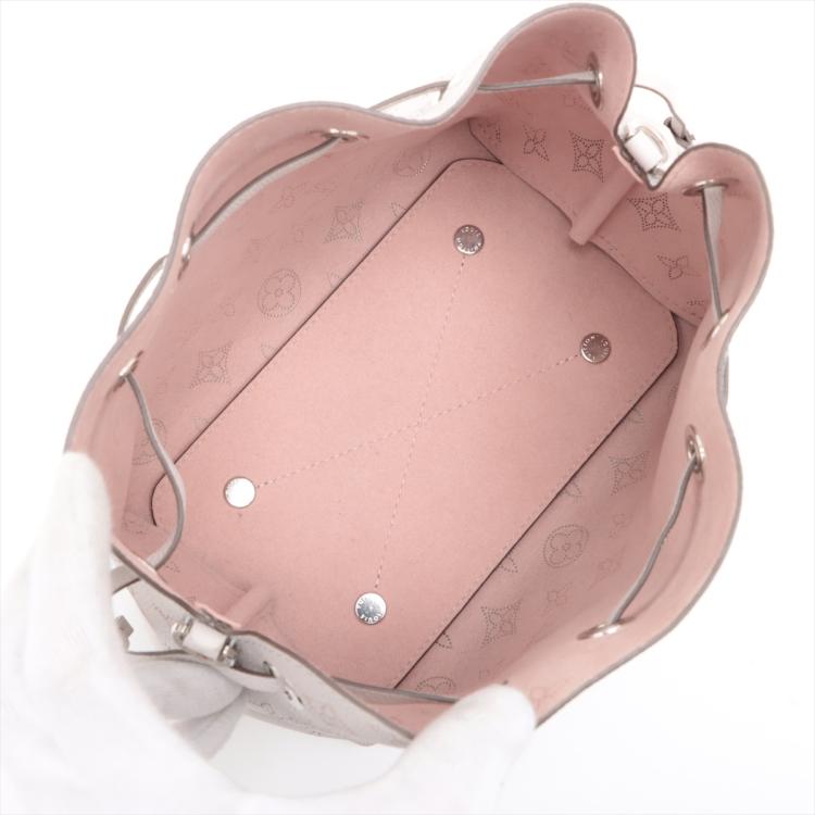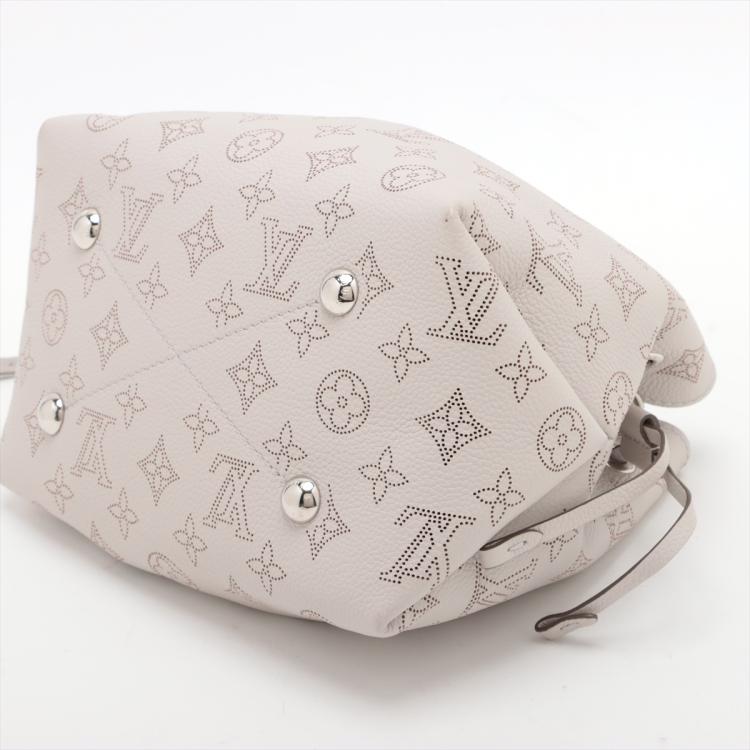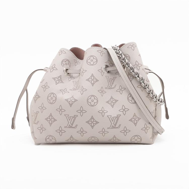 Louis Vuitton Bella bucket bag in Mahina perforated calfskin in light grey. Featuring silver tone hardware, a detachable braised handle. Leather drawstring closure on top opens to a pink microfibre lining interior. Approximate dimensions: 21cm(L) x 18.5cm(H) x 13cm(D), 15cm handle drop and 50-56cm strap drop. Accompanied by a round coin purse. With Entrupy Certificate of Authenticity. (Pre-owned)