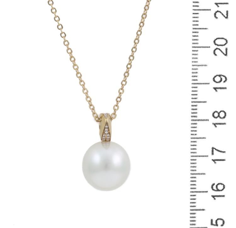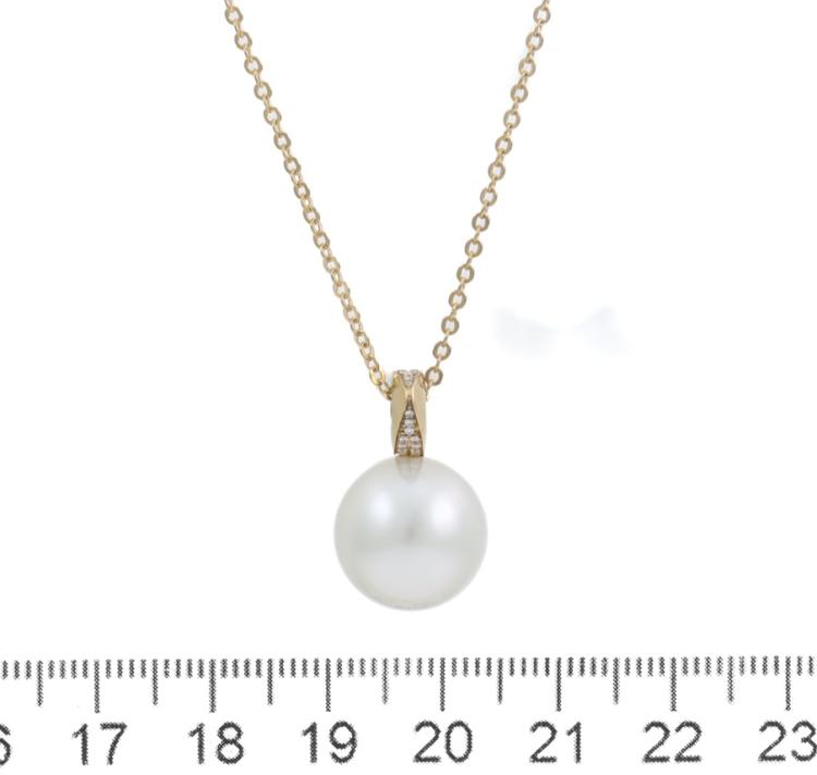 Paspaley Pearl & Diamond pendant with Australian South Sea Pearl of 12.7mm and round Natural Diamonds totalling approximately 0.10ct. 18ct yellow gold with Paspaley 18ct yellow gold 42cm chain. Weight: 7.6g. With Paspaley box. (Pre-owned)