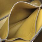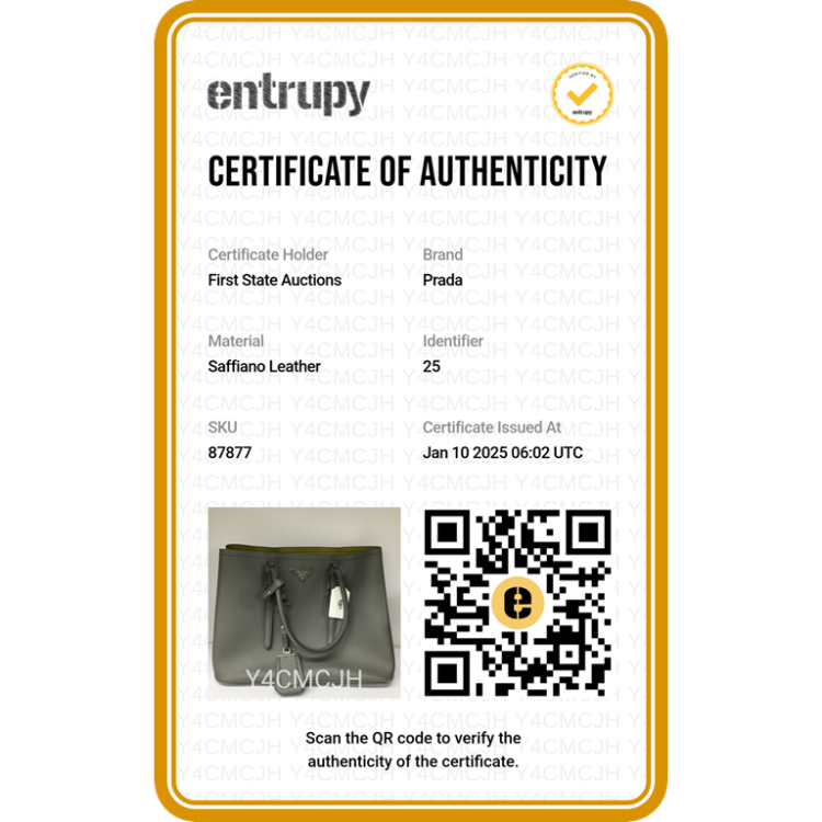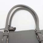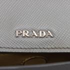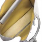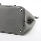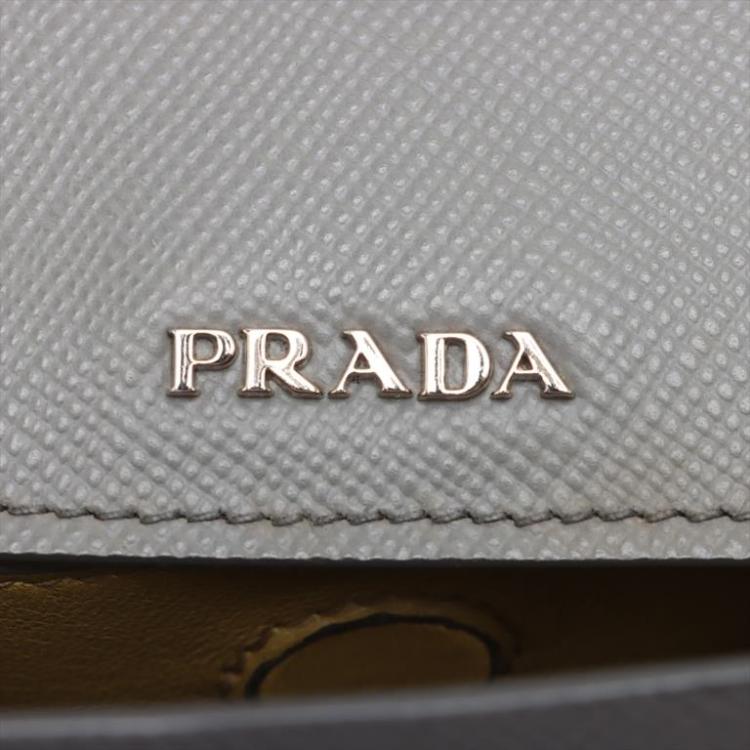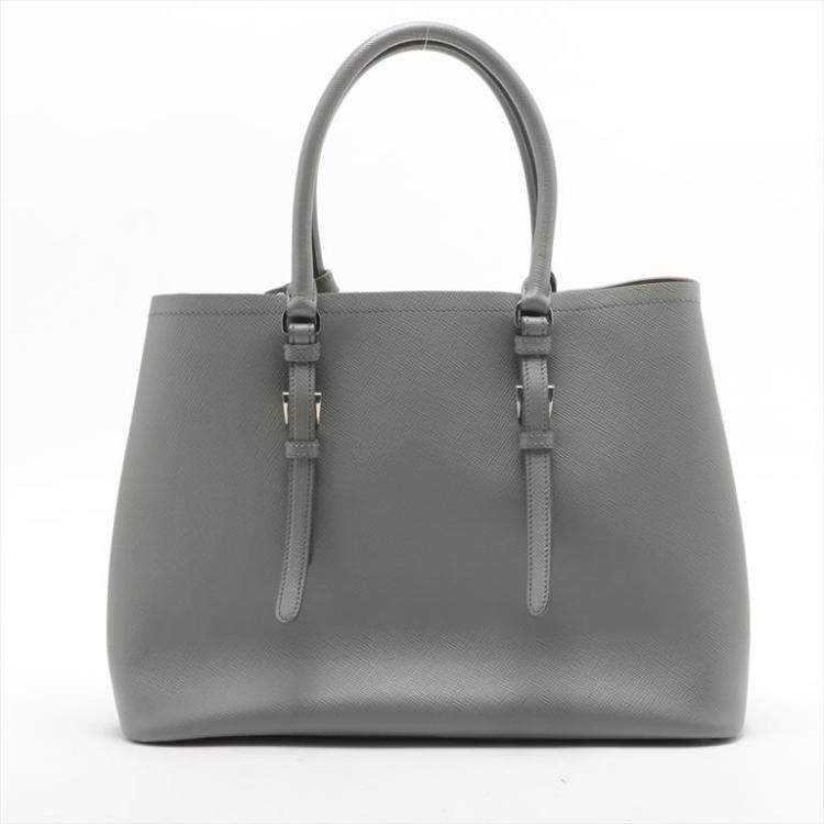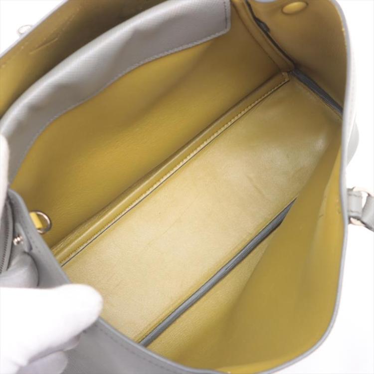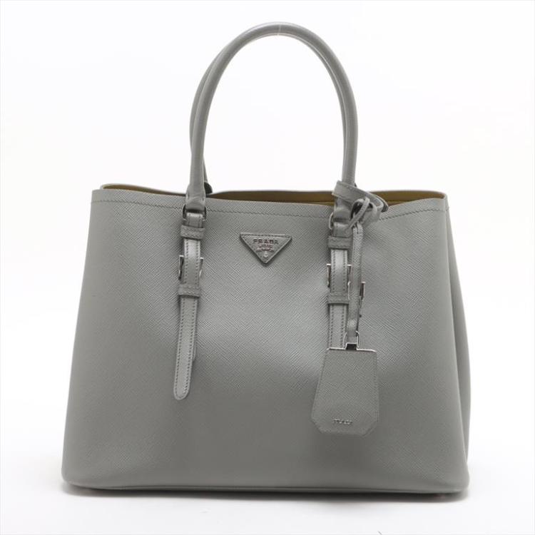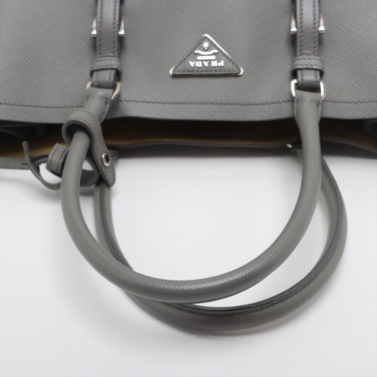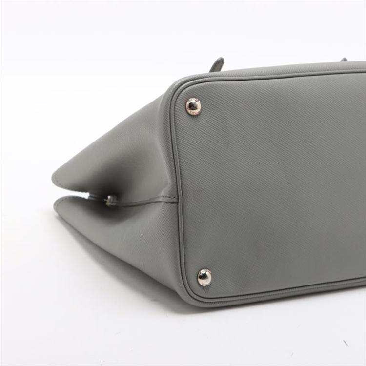 Prada double bag in gray Saffiano leather. Featuring silver-tone hardware, double handles, metal lettering logo on a triangle plate at front, snap buttons on sides. The top opens to yellow Nappa leather interior with 2 compartments separated by centre flat pocket. Approx dimensions: 36cm(Base-L) x 27cm(H) x 17cm(D), 15cm handle drop, adjustable. Accompanied by handle belt and nametag. Note: shoulder strap NOT included. With Entrupy Certificate of Authenticity. (Pre-owned)