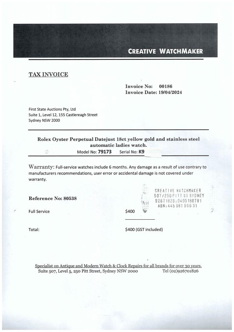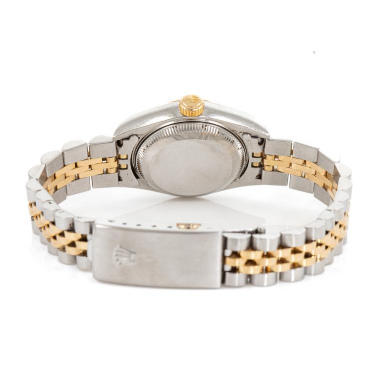 Rolex Oyster Perpetual Datejust 18ct yellow gold and stainless steel automatic ladies watch. Gold dial, date, case diameter: 26mm, wrist size:17cm, Swiss made. Ref# 79173. Circa: 2001. With Rolex two tone Jubilee bracelet and clasp. With Certificate of Authenticity, Creative watchmaker invoice dated 19/04/24 and Rolex box. 6 month of Watchmaker warranty from the date of full service. (Pre-owned)