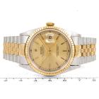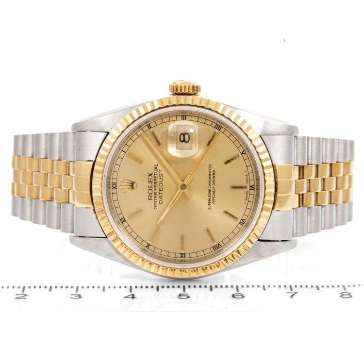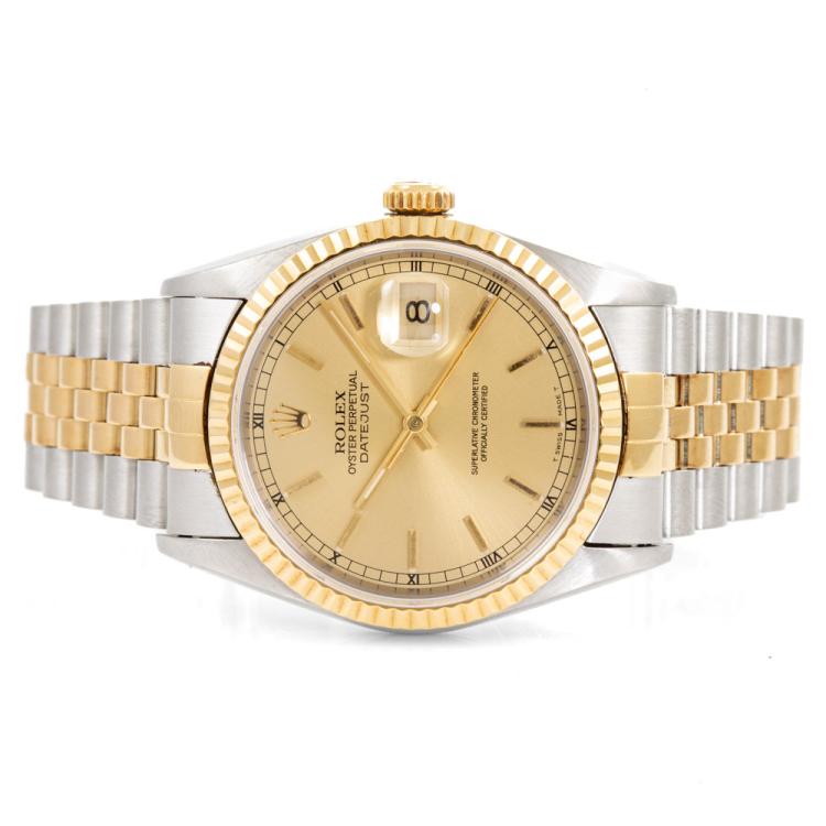 Rolex Oyster Perpetual Datejust 18ct yellow gold and stainless steel automatic mens watch. Gold dial, date, case diameter: 36mm, wrist size: 18cm, Swiss made, Circa: 1995. Ref# 16233. With Rolex two-tone Jubilee bracelet and clasp. With Certificate of Authenticity and Rolex box. 3 month FSA warranty (Pre-owned)