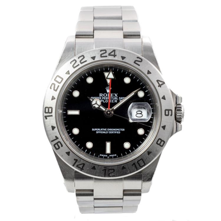 Rolex Oyster Perpetual Explorer II stainless steel automatic mens watch. Black dial, date, case diameter: 40mm, wrist size: 18cm, Swiss made. Ref# 16570. Circa: 2002. With Rolex stainless steel Oyster bracelet and clasp. With Certificate of Authenticity, Rolex Guarantee Certificate dated 03/10/2003 and Rolex box. 3 month FSA warranty (Pre-owned)