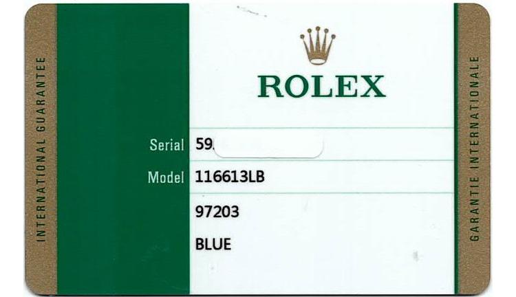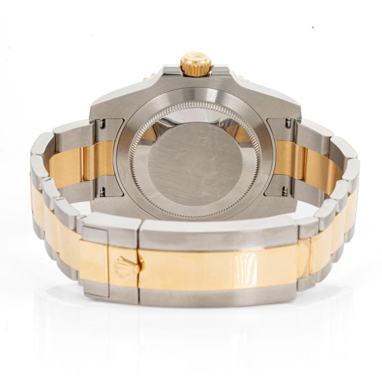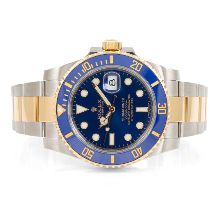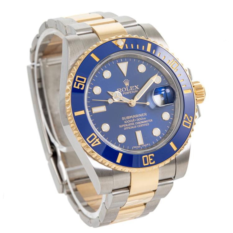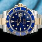 Rolex Oyster Perpetual Date Submariner 18ct yellow gold and stainless steel automatic mens watch. Blue dial, date, case diameter: 40mm, wrist size: 18cm, Swiss made. Ref# 116613LB. Circa: 2011-2024. With Rolex two-tone Oyster bracelet and clasp. With Certificate of Authenticity and Rolex International Guarantee card dated 10/18/2017. 3 month FSA warranty (Pre-owned)