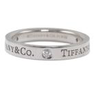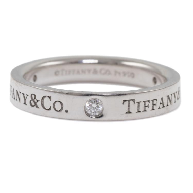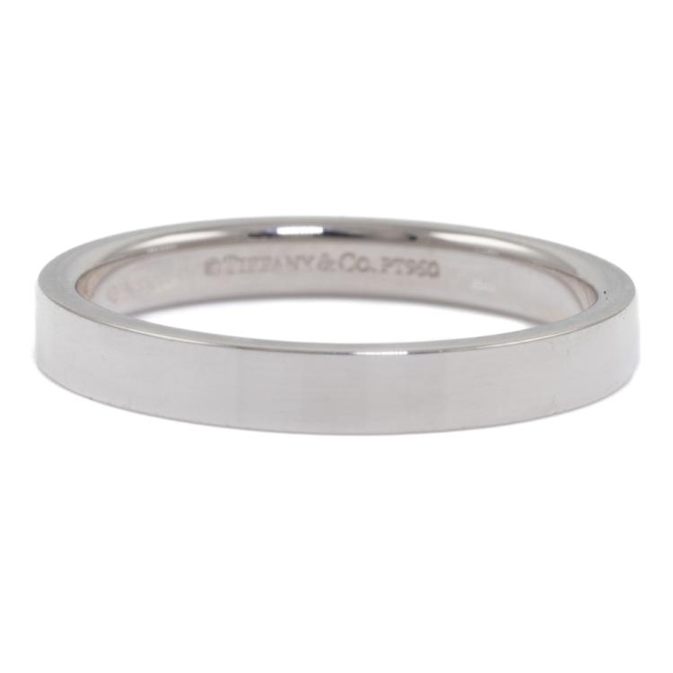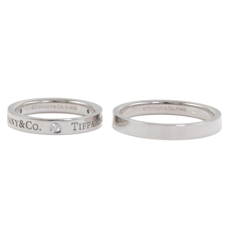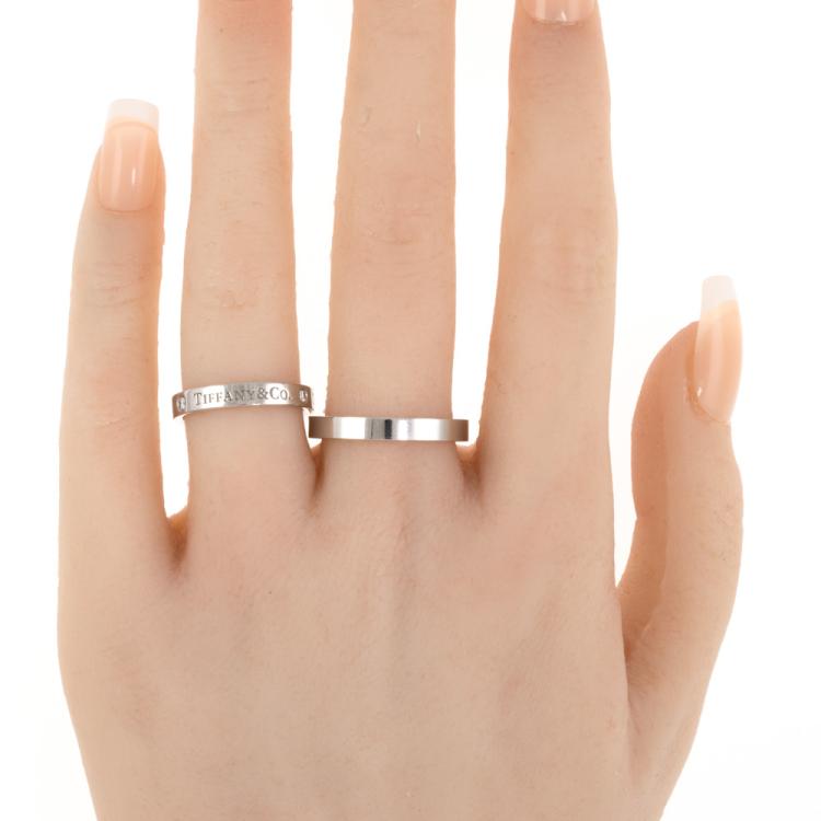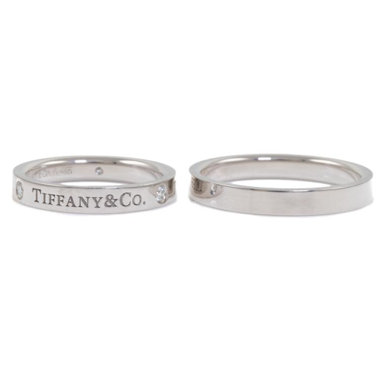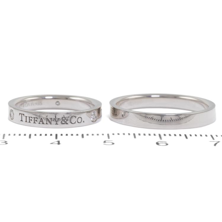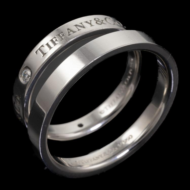 Tiffany & Co band ring set. 1) T & Co. band ring with 3 round natural Diamonds totalling 0.07ct. Platinum 950. Ring size J1/2 - ring resizing is not recommended. Band width: 3.2mm. 2) Tiffany & Co wedding band. Ring size: R - ring resizing is not recommended. Band width: 3.1mm. Both platinum 950. Total weight: 11.5g. With Tiffany & Co. box. (Pre-owned)