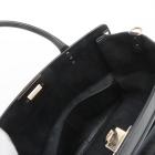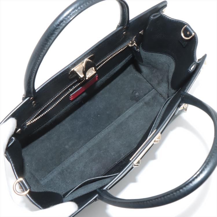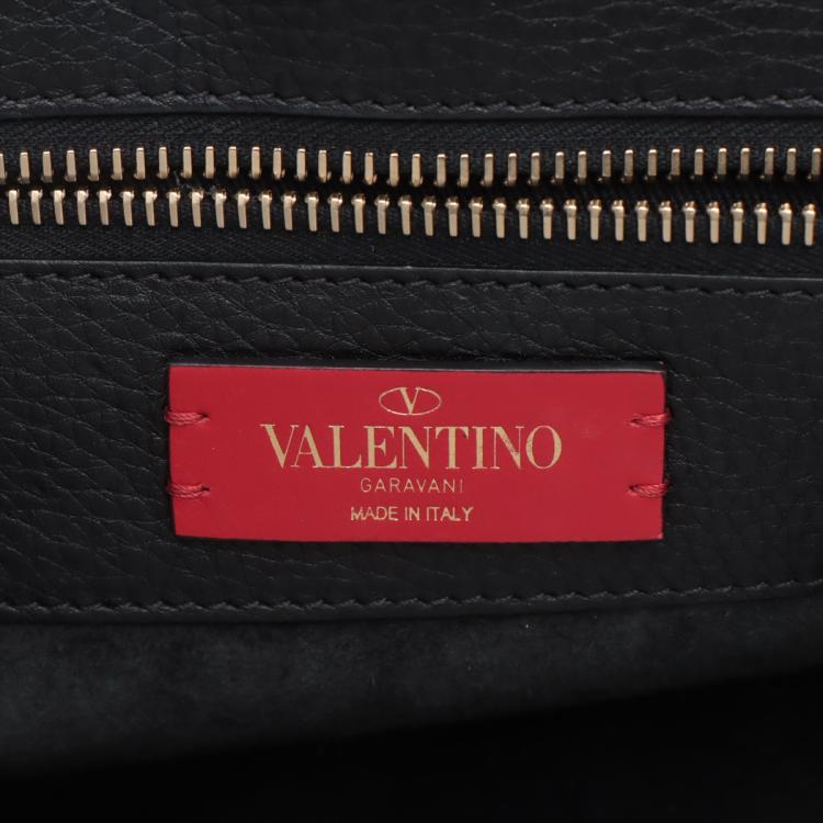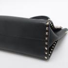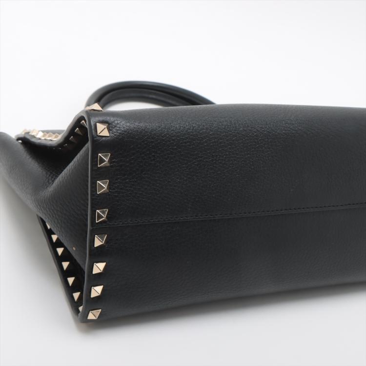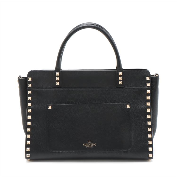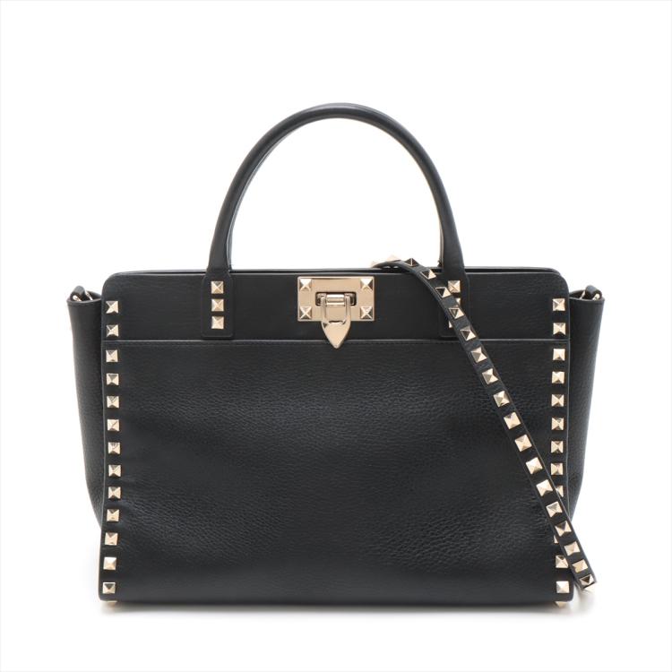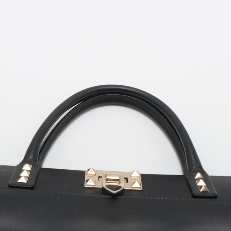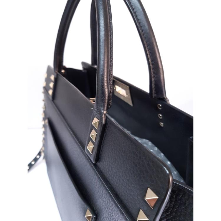 Valentino Garavani Rockstud bag in black grainy calfskin. Featuring a flat pocket at back, light gold-toned studs and hardware, pyramid studs lining the borders of the bag body and shoulder strap. A studded turn-lock closure on top. This opens to a spacious black suede leather interior with patched and zipped pockets. Approximate dimensions: 30cm(L) x 20cm(H) x 12.5cm(D), 10cm handle height and 48cm strap height. With Entrupy Certificate of Authenticity. (Pre-owned)