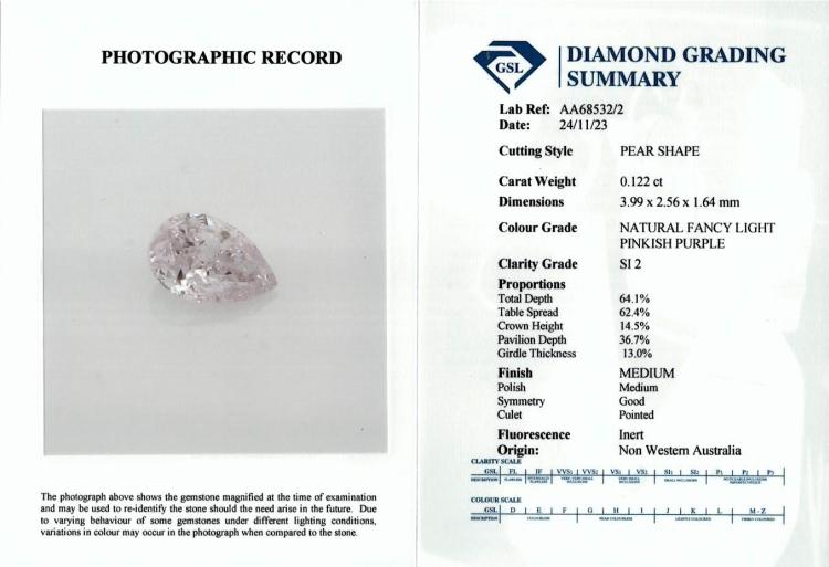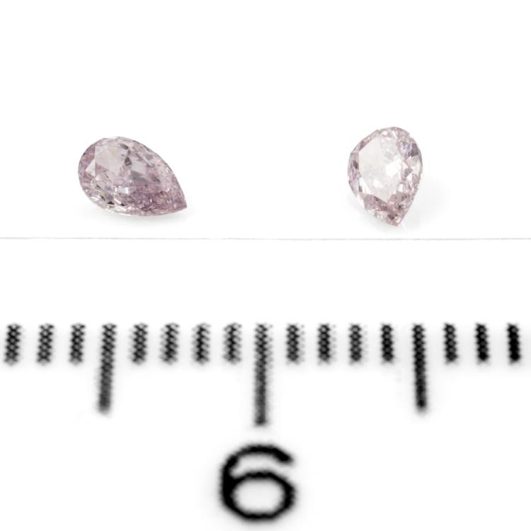 A loose pair of pear shape Natural Diamonds totalling 0.24ct (With GSL Diamond Grading Summary graded as Natural Fancy Light Pinkish Purple SI2, #AA68532/2, AA68532/3). (new)