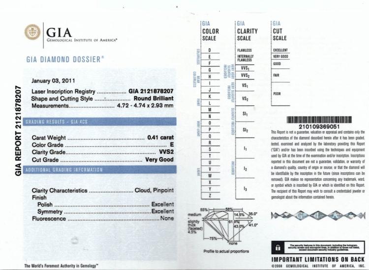 Cartier solitaire Diamond ring with a round brilliant cut Diamond of 0.41ct (with GIA Diamond Dossier graded as E VVS2 #2121878207). Platinum 950. Cartier stamped size 48, measures as I - ring resize is not recommended. Band width: 1.6mm-1.9mm. Weight: 2.7g. With Cartier box (slightly worn condition) and Cartier cleaning kit. With Brisbane Valuation Service valuation dated 11/05/18. (Pre-owned)