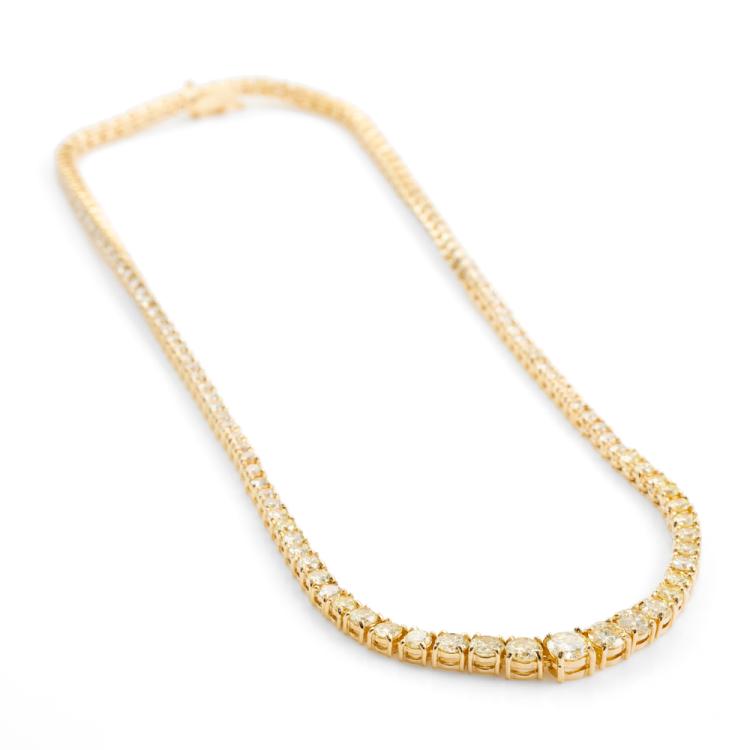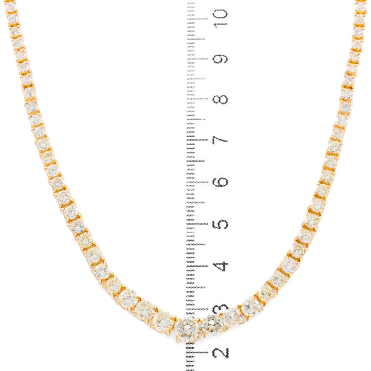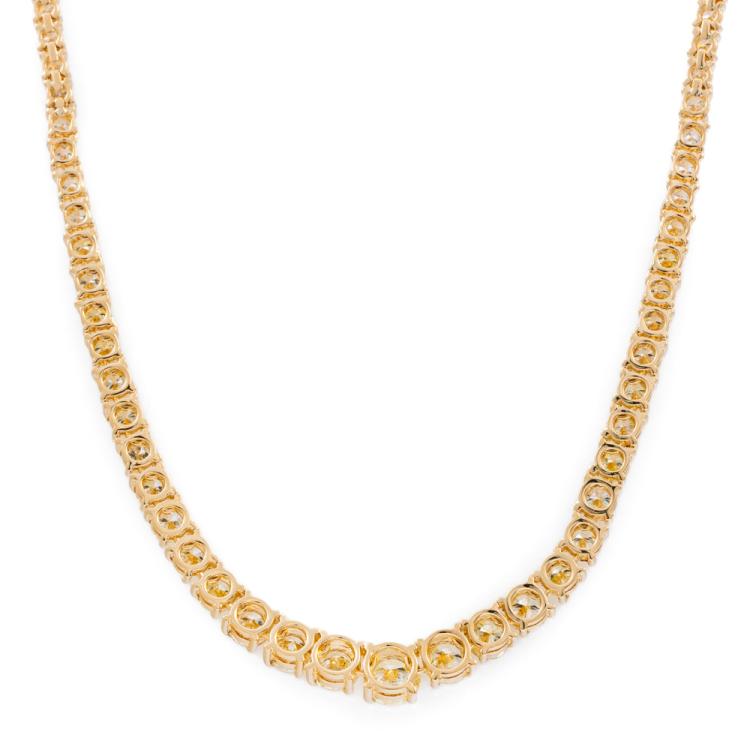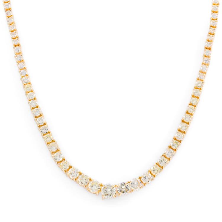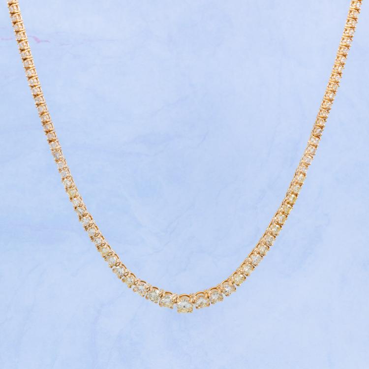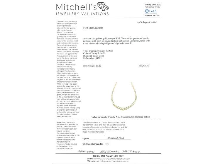 Diamond graduated tennis necklace with round Natural Diamonds totalling 10.00ct (Estimated grading: L-M SI). 18ct yellow gold. Length: 41.0cm. Weight: 26.2g. With Valuation Certificate #419057. (Pre-owned)