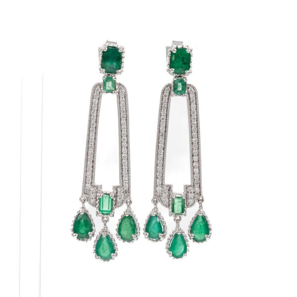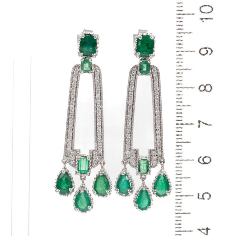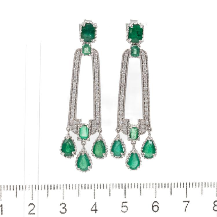 Emerald and Diamond chandelier earrings with emerald cut & pear shape natural Emerald totalling approximately 2.50ct and round natural Diamonds totalling approximately1.00ct (Estimated grading: H-I SI-P1). Length: 48mm. 18ct white gold. Weight: 12.3g. With Certificate #418621. (Pre-owned)
