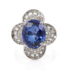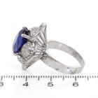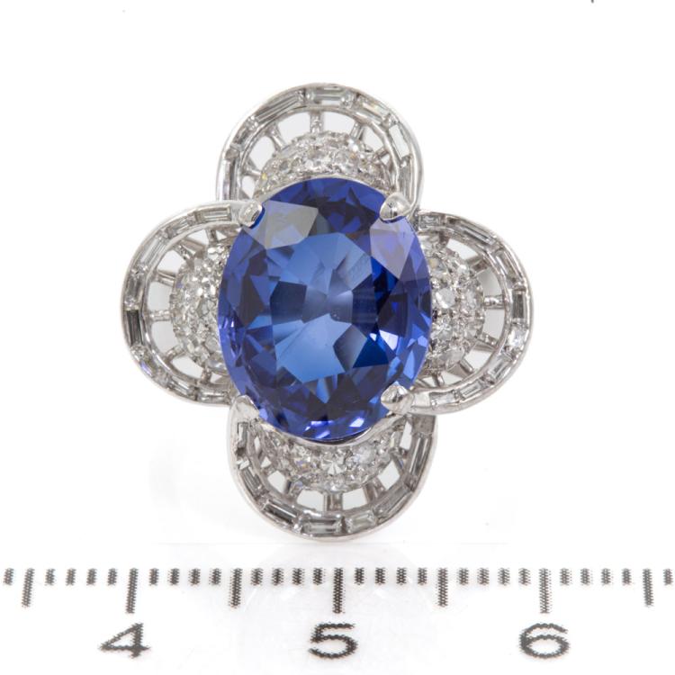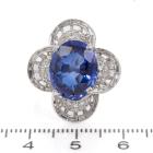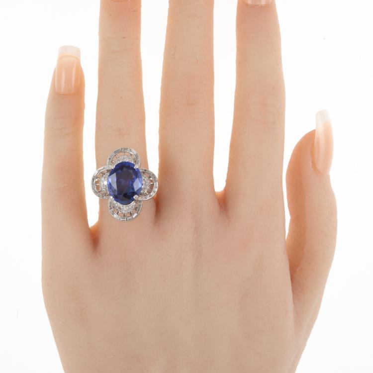 Sapphire and Diamond ring with oval shape Natural blue Sapphire of approximately 7.40ct and round Natural Diamonds totalling approximately 0.64cts (Estimated grading: I-J SI). 9ct white gold (XRF tested, not stamped). Ring size L½. Band width: 3.1 - 4.7mm. Weight: 8.0g. With Certificate #418576. (Pre-owned)