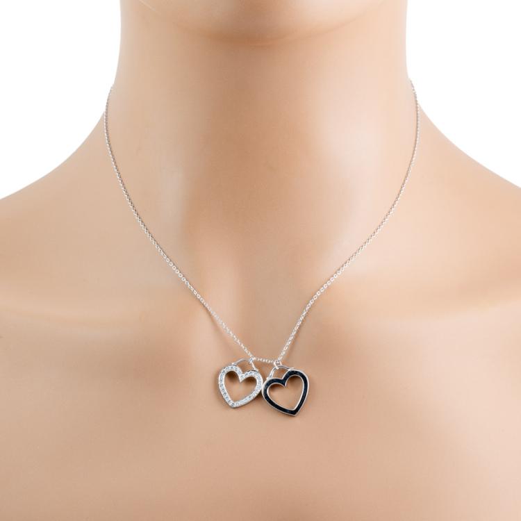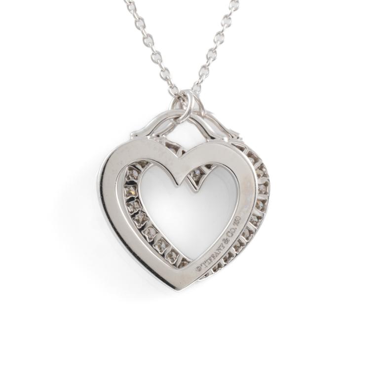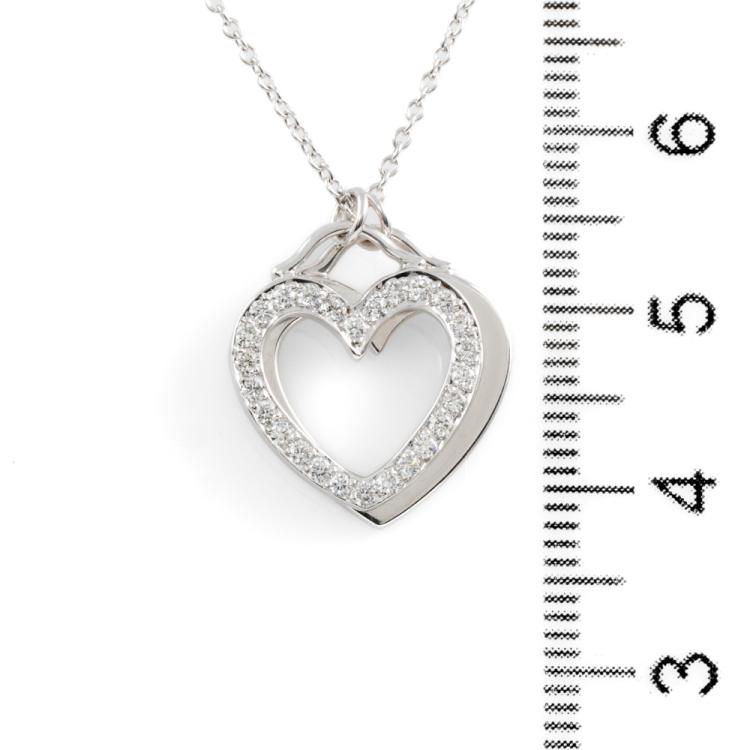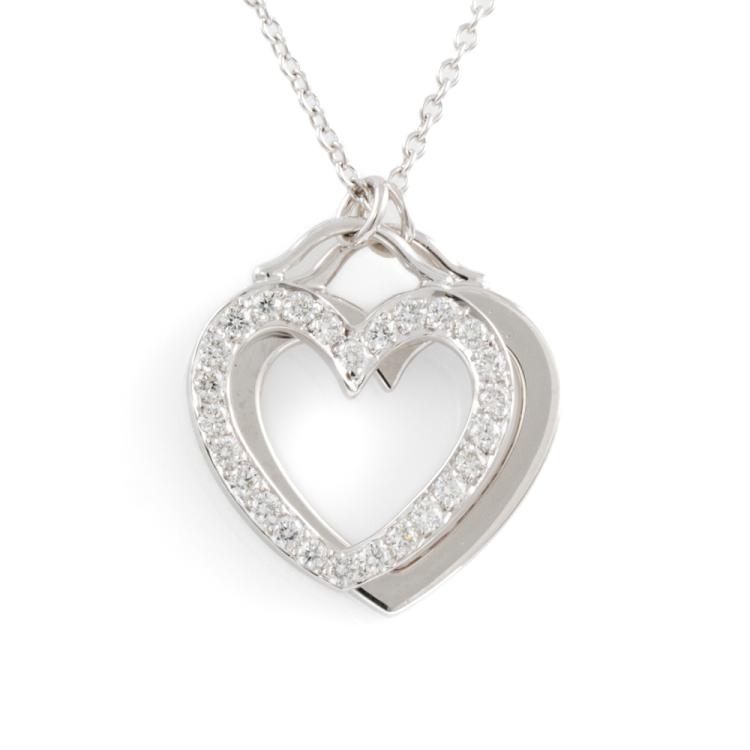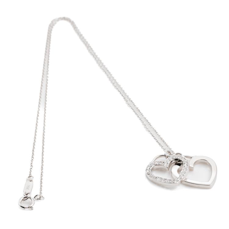 Tiffany & Co Sentimental Double Heart pendant with round natural Diamond totalling approximately 0.20ct. Motif size 14.7mm x 16.8mm. 18ct white gold with 40cm 18ct white gold Tiffany & Co chain. Weight: 4.4g. (Pre-owned)