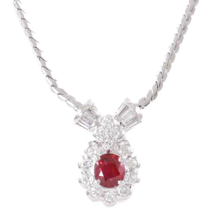 Ruby and Diamond necklace with round Natural Diamonds of 0.42ct and round Natural Diamonds totalling 0.35ct (Estimated Grading: H-I SI). Platinum - 900 with attached platinum-850 41.5cm chain . Weight: 9.5g. (Pre-owned)