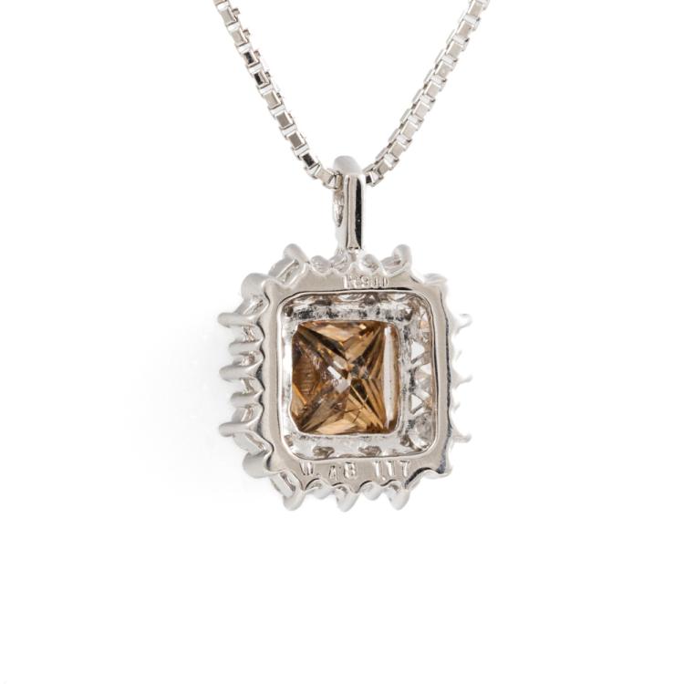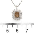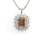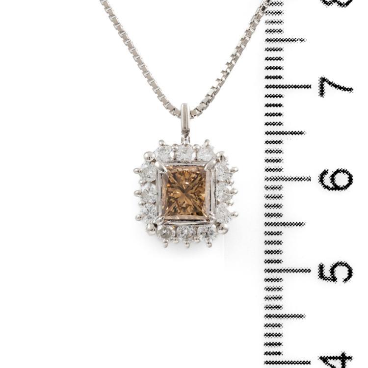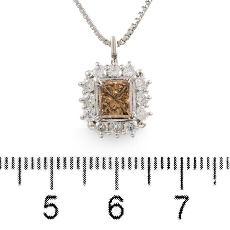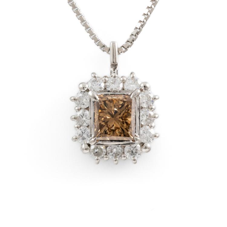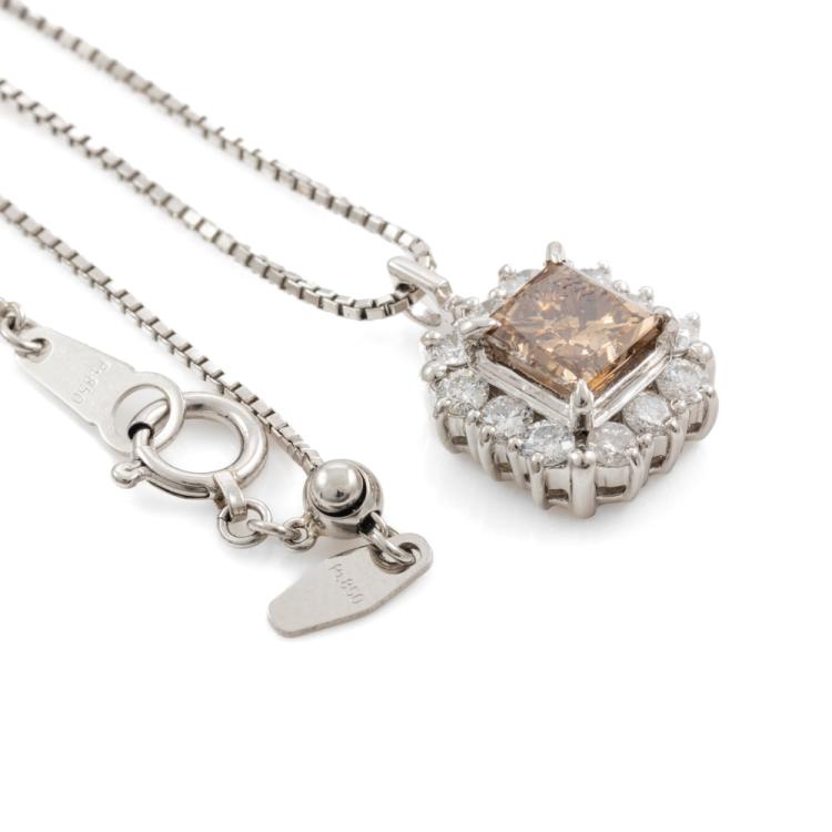 Diamond dress pendant with centre rectangular princess cut natural Champagne Diamond totalling of 0.48ct (Estimated grading: Deep Champagne P1), round Natural Diamonds totalling 1.17ct (estimated grading: H-I P1). Platinum-900 with Platinum 850 adjustable 45cm chain. Weight: 6.4g. With Valuation Certificate #419016. (Pre-owned)