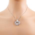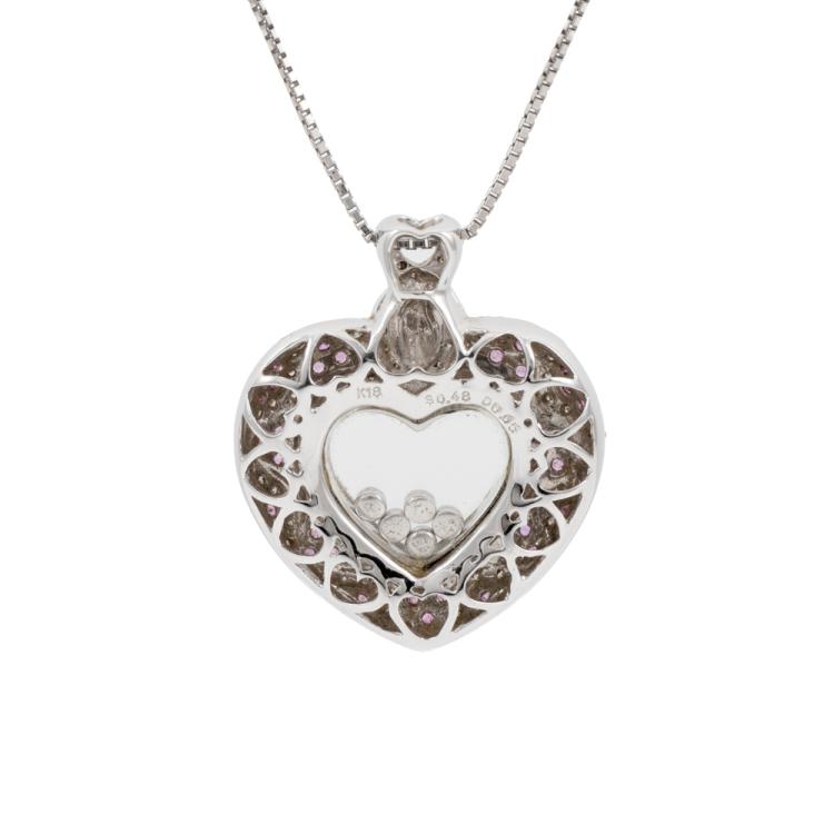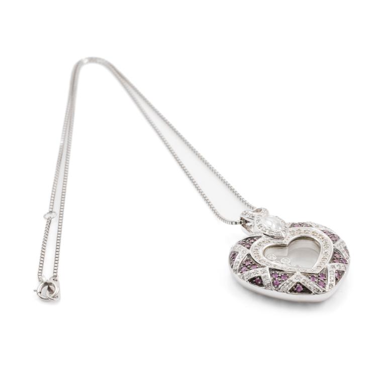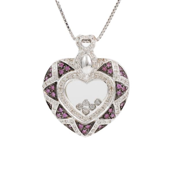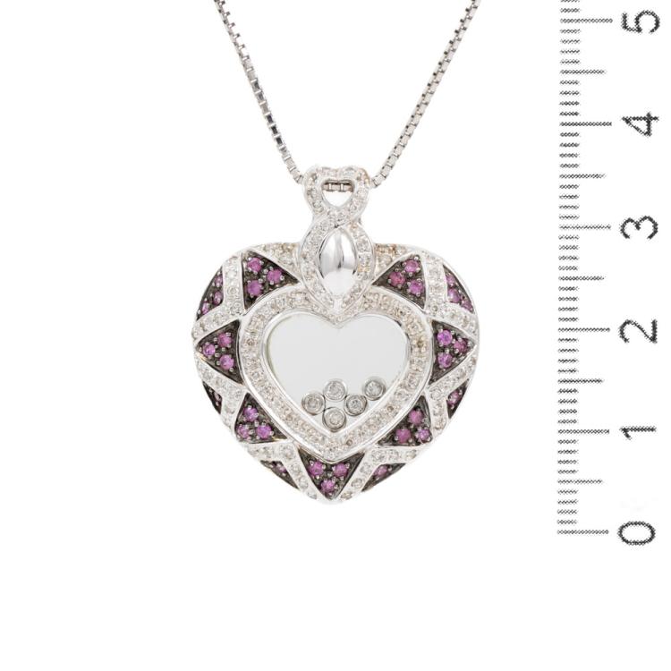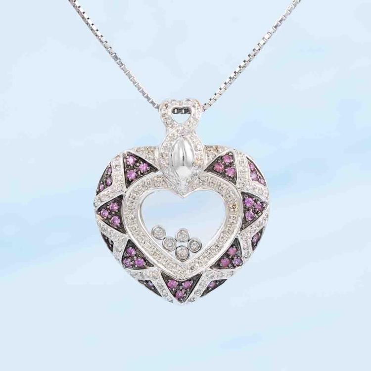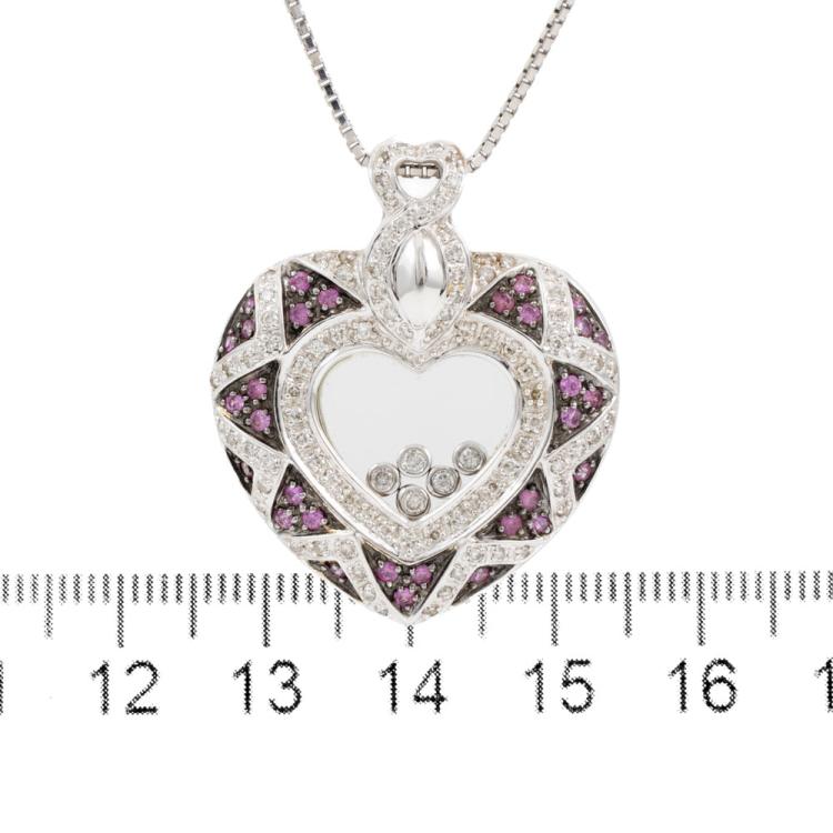 Sapphire and Diamond pendant with round natural pink Sapphire totalling 0.48ct and round pave set & floating natural Diamonds totalling 0.65ct (Estimated grading: H-I SI-P1). 18ct white gold with black rhodium plating and with a 40cm platinum 850 chain. Weight: 17.0g. (Pre-owned)