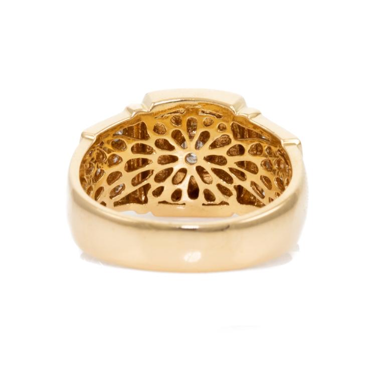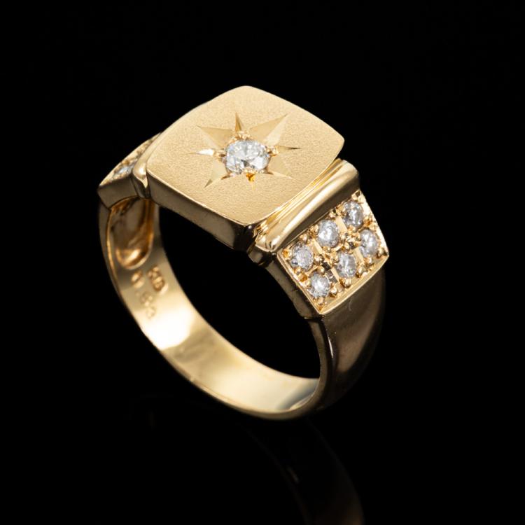 Mens ring with round natural Diamonds totalling 0.53ct (Estimated grading: H-I SI2-P2). 18ct yellow gold. Ring size Q. Band width: 4.6 - 7.7mm. Weight: 7.5g. (Pre-owned)