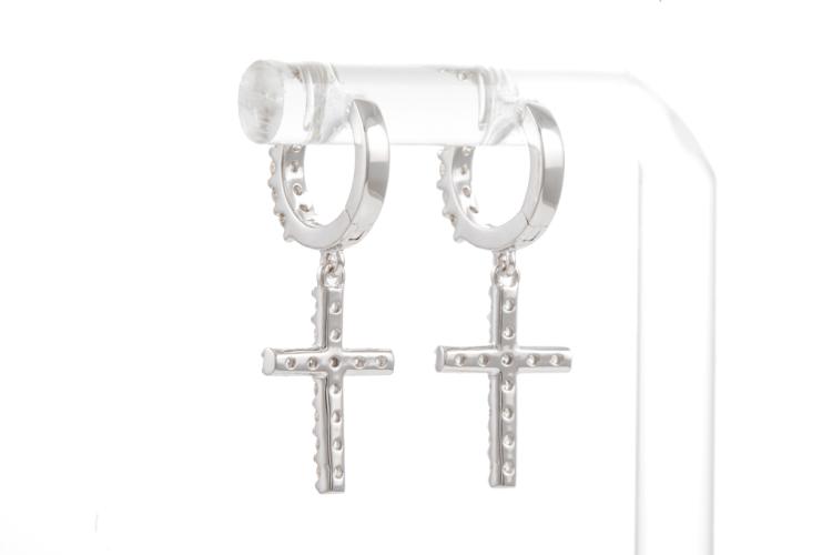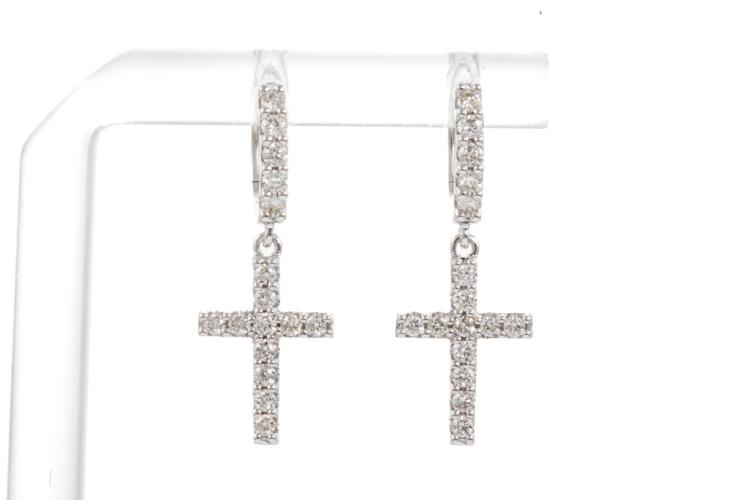 Diamond cross hoop earrings with 32 round Natural Diamonds totalling 0.67ct (Estimated grading: I-J SI). 14ct white gold. Weight: 3.5g. (New).