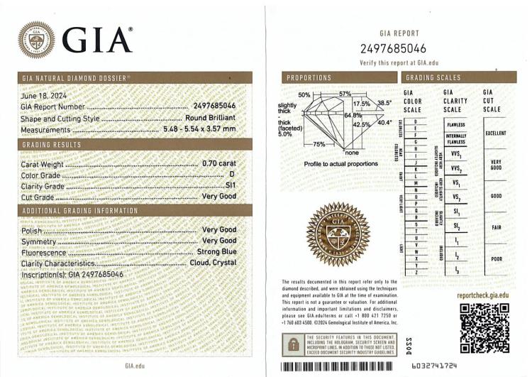 Diamond solitaire pendant with round brilliant cut Natural Diamond of 0.70ct (with GIA summary Report graded as D SI1#2497685046). 18ct white gold with 18ct white gold attached chain. Length: 41.0cm. Weight: 1.5g. (New)