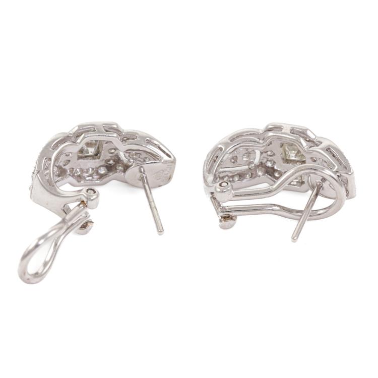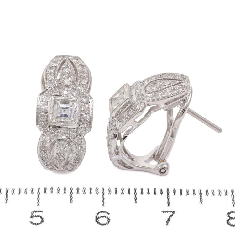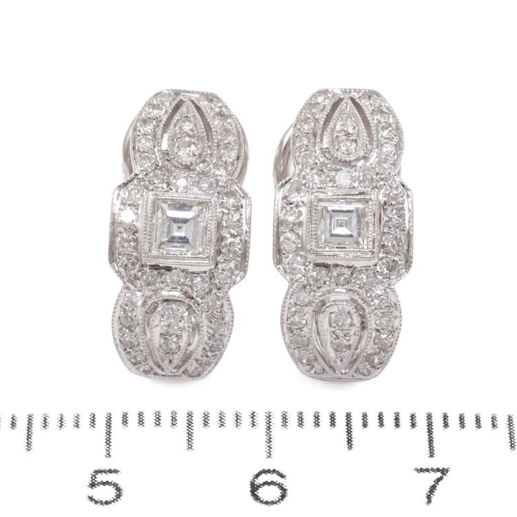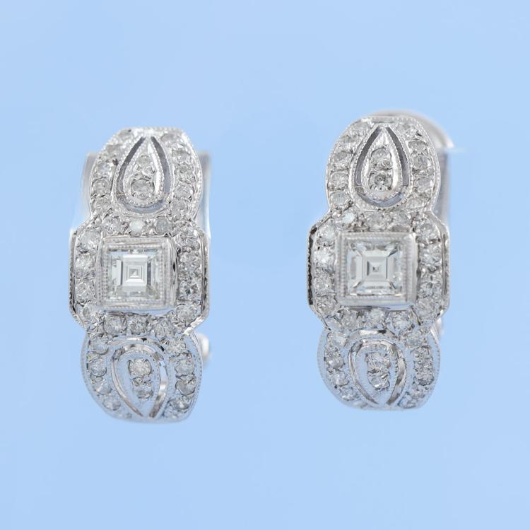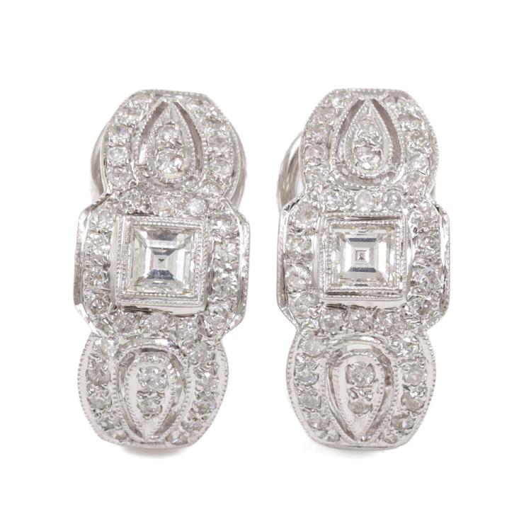 Diamond clip-on earrings (for pierced ears) with round & carre cut Natural Diamonds totalling approximately 0.75ct (Estimated grading: I-J SI-P1). 18ct white gold. Weight: 6.1g. (Pre-owned )
