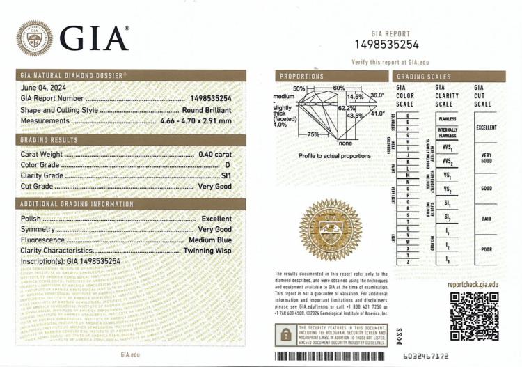 Diamond stud earrings with 2 round brilliant cut natural Diamonds totalling 0.80ct (with GIA Summary Reports graded as D SI1 #6491587669, 1498535254). 18ct white gold. Weight: 0.9g. (New)