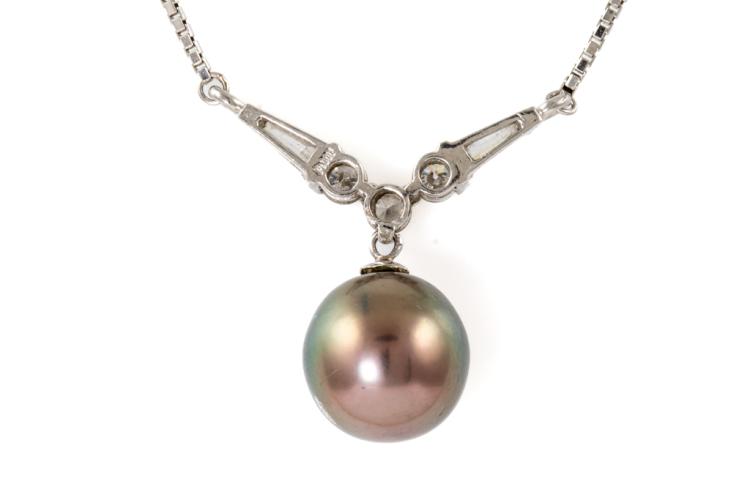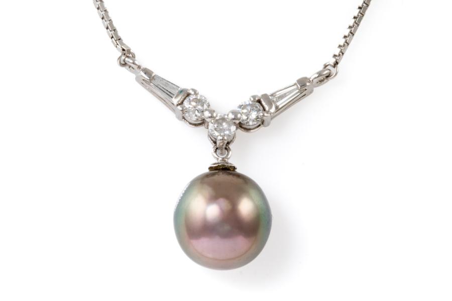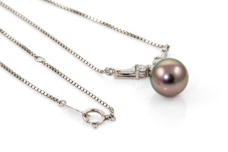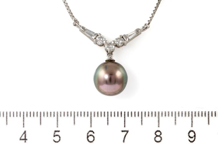 Tahitian Pearl and Diamond necklace with Tahitian Pearl of 10.0mm and baguette cut and round Natural Diamonds totalling 0.45ct (Estimated grading: H SI). Platinum 900 with platinum 850 attached chain. Length: Maximum 42cm. Weight: 6.7g. (Pre-owned)