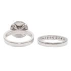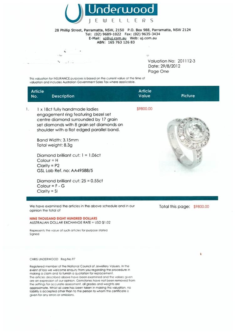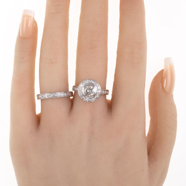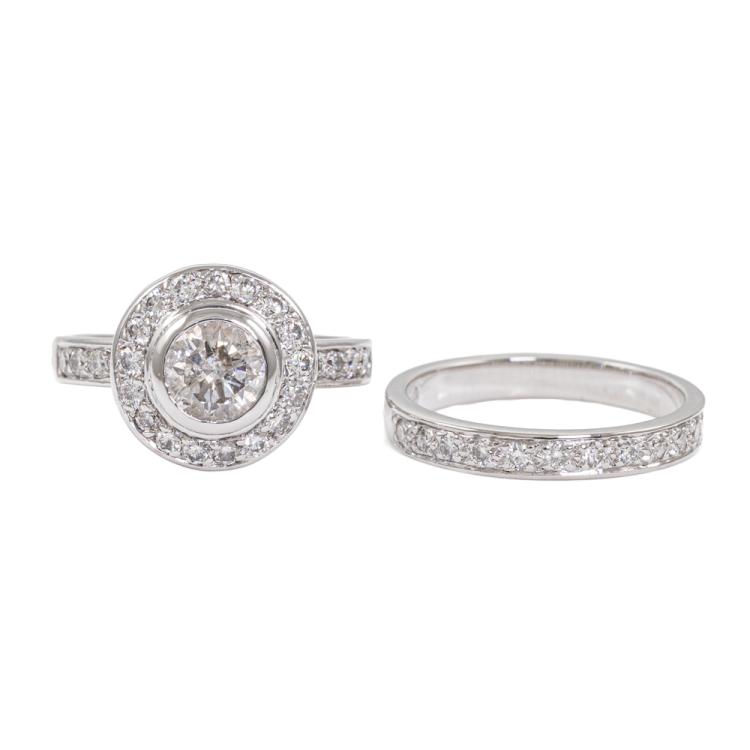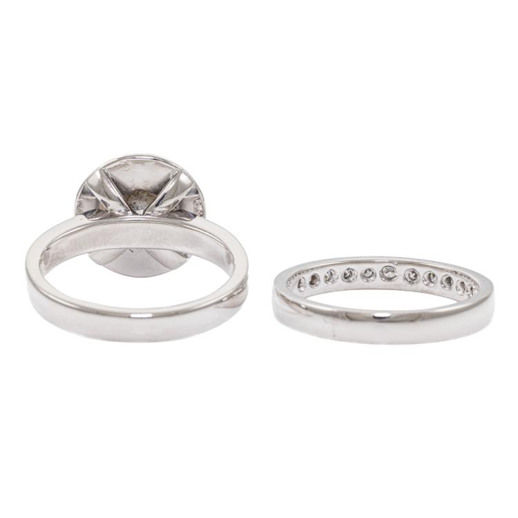 Diamond engagement ring Set. 1) Diamond halo ring with a centre round brilliant cut Natural Diamond of 1.06ct (with GSL Summary Report graded as H P2 #AA 49588/5) and remaining round Natural Diamonds totalling 0.55ct (Valuation Certificate graded as F-G SI). 2) Matching eternity ring with round Natural Diamonds totalling approximately 0.20ct. Both 18ct white gold. Ring size M. Both band width: 2.9mm. Total weight: 11.4g. With copy of Valuation #201112-3. (Pre-owned)