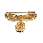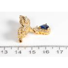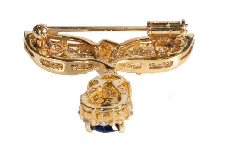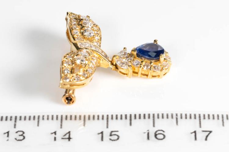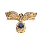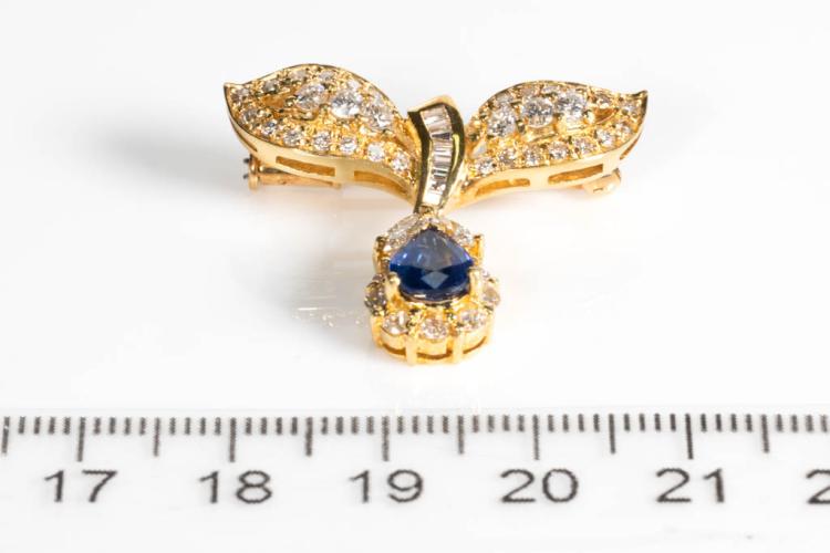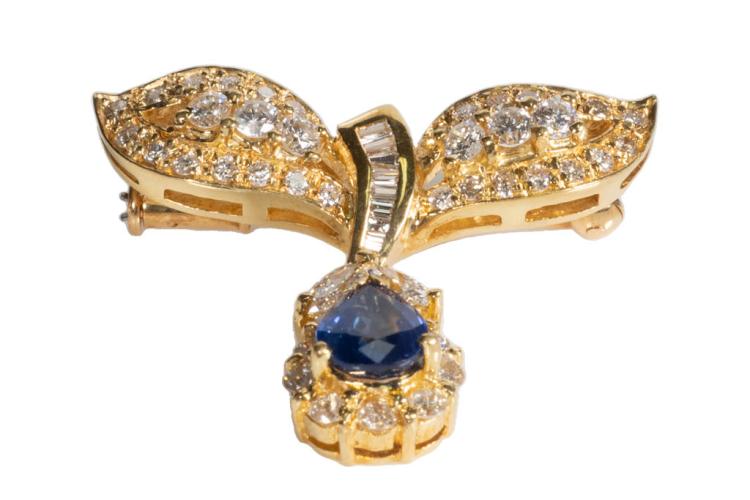 Sapphire and Diamond brooch with pear shape blue Sapphire of 1.06cts with baguette, round and pear shape Diamonds totalling 1.41cts (Estimated grading: G-H SI). 18ct yellow gold. Weight: 6.8g (Pre-owned)
