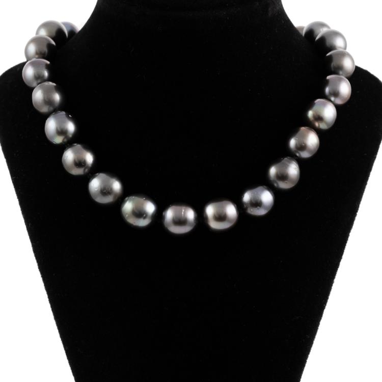 Pearl necklace with 37 slightly graduated Tahitian Pearl of 10.9mm - 9.3mm. 14ct white gold 10mm ball clasp. Length: 46cm. Weight: 63.7g. (Pre-owned)