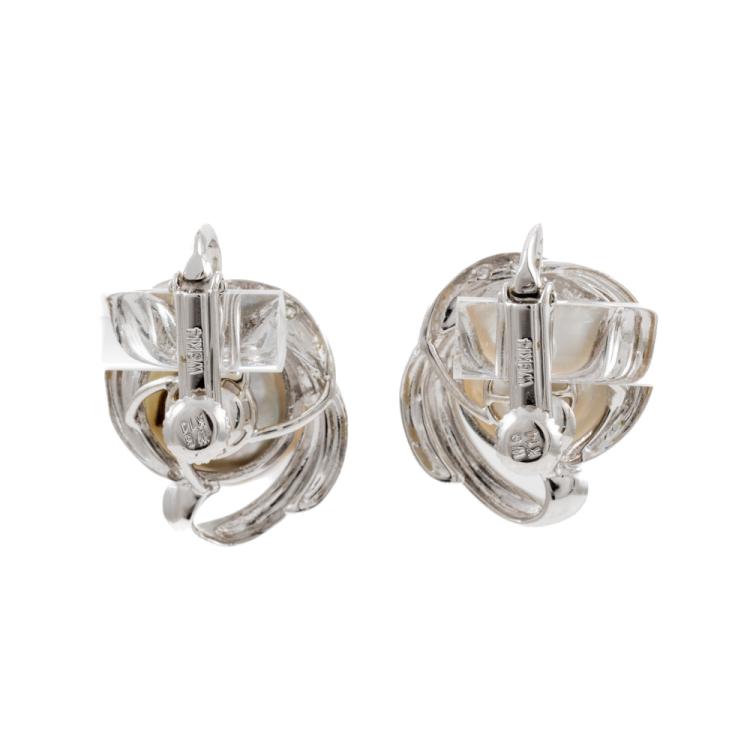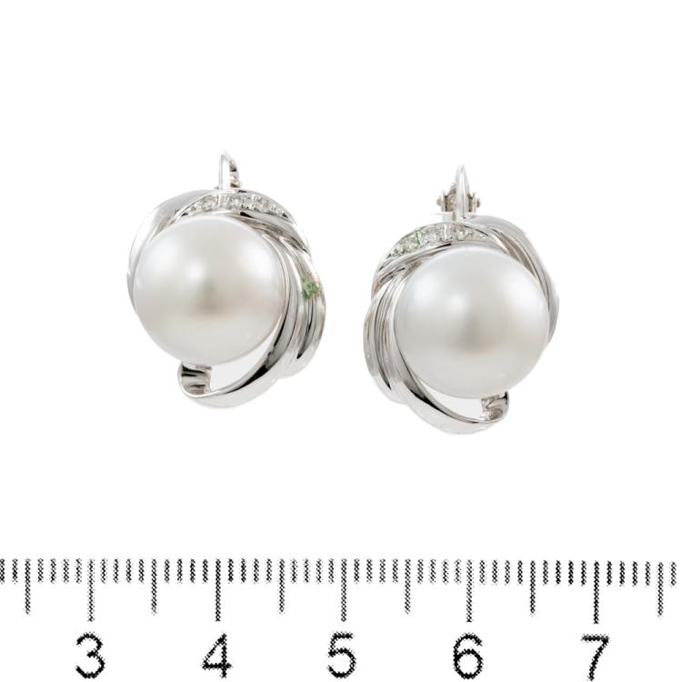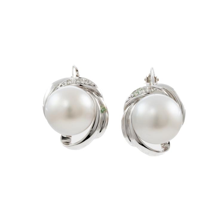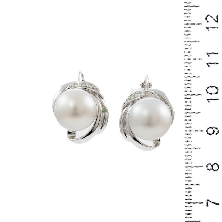 Pearl and Diamond clip-on earrings with 2 South Sea Pearls of 11.6mm & 11.5mm and round natural Diamonds totalling 0.03ct. 14ct white gold. Weight: 9.2g. (Pre-owned)