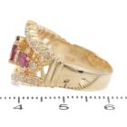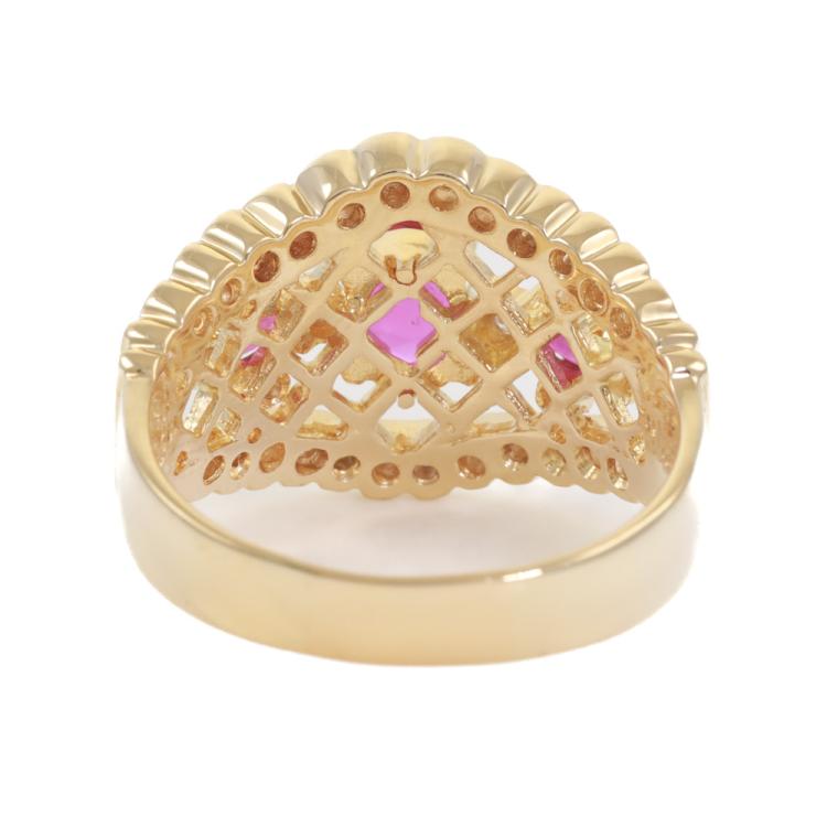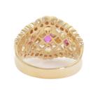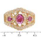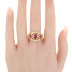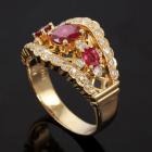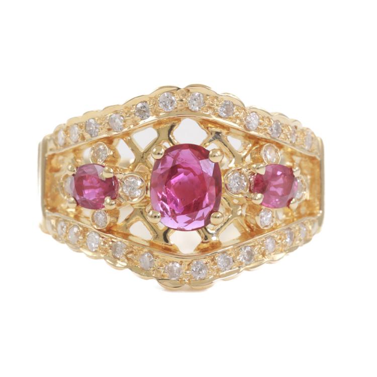 Ruby and Diamond ring with centre oval Natural Ruby of 0.60ct, 2 shoulder oval Natural Rubies totalling 0.59ct and surrounded by round Natural Diamonds totalling 0.35ct (Estimated grading: H-I SI). 18ct yellow gold. Ring size Q1/2. Bandwidth: 3.7mm - 5.5g. Weight: 8.9g. ( Pre-owned)