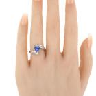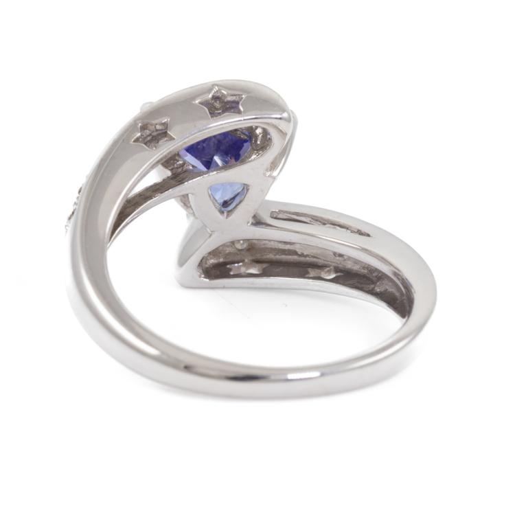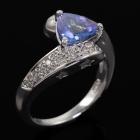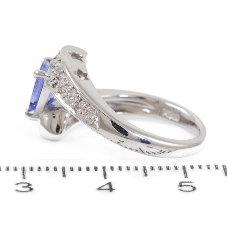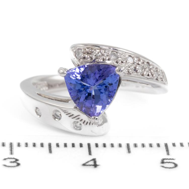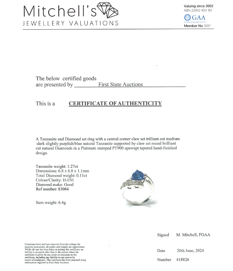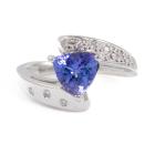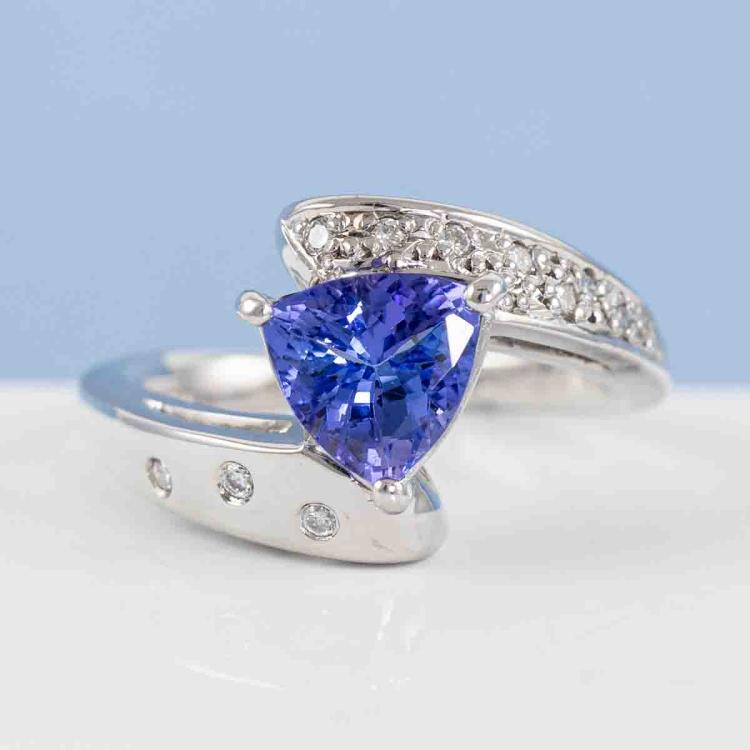 Tanzanite and Diamond ring with trilliant cut natural Tanzanite of 1.27ct and round natural Diamonds totalling 0.11ct. Platinum-900. Ring size K1/2. Band width 1.8mm - 3.3mm. Weight: 6.4g. With Certificate #418826. (Pre-owned)