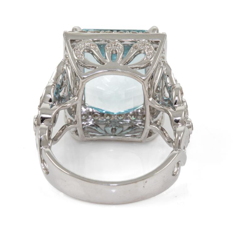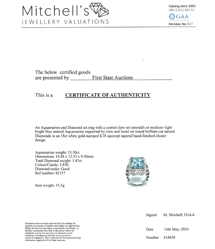 Aquamarine and Diamond ring with an emerald cut natural Aquamarine of 13.50ct and round natural Diamonds totalling 1.47ct (Estimated grading: I-J SI). 18ct white gold. Ring size T. Band width: 4.4mm - 5.5mm. Weight: 15.3g. With Certificate #418658. (Pre-owned)