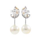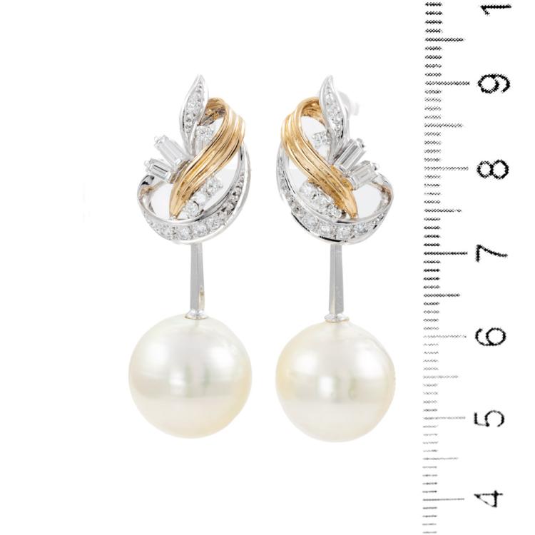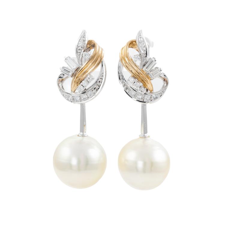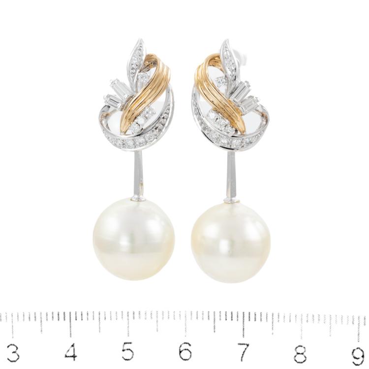Pearl and Diamond screw back clip-on earrings with cream South Sea Pearls of 13.5mm & 14.0mm with baguette cut & round Natural Diamonds totalling 0.56ct (Estimated grading: H SI). 18ct yellow gold and platinum 900 and 14ct white gold (clip-on). Weight: 15.6g. (Pre-owned)