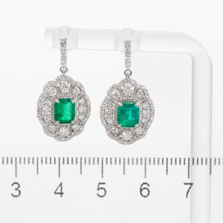 Emerald and Diamond drop earrings with emerald cut natural Emeralds totalling 1.38ct and round natural Diamonds totalling 1.10ct (Estimated grading: G-H SI). Platinum with 18ct white gold backs. Weight: 6.3g. With Certificate #418828. (Pre-owned)
