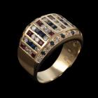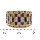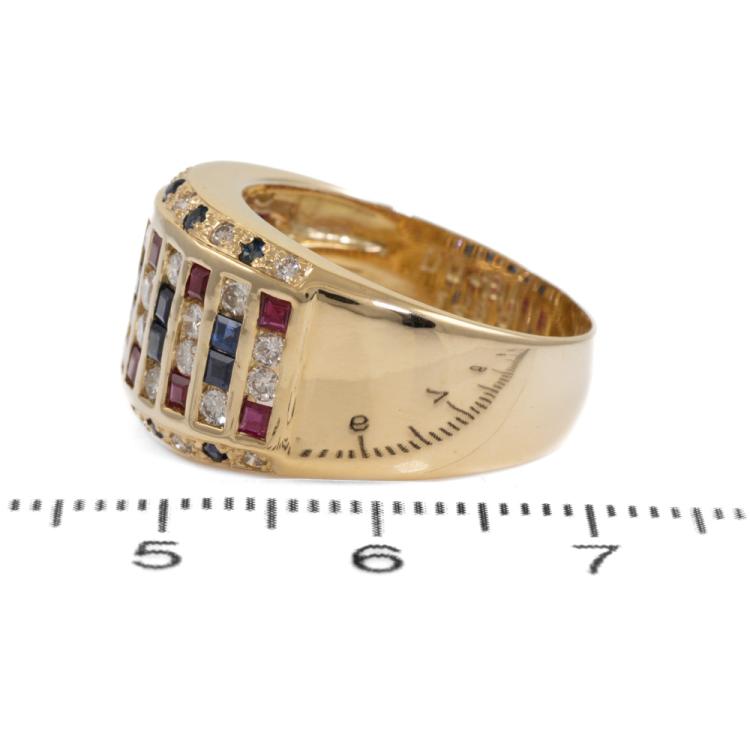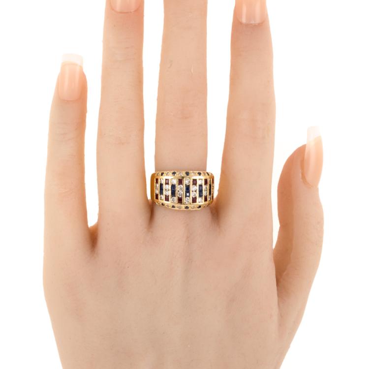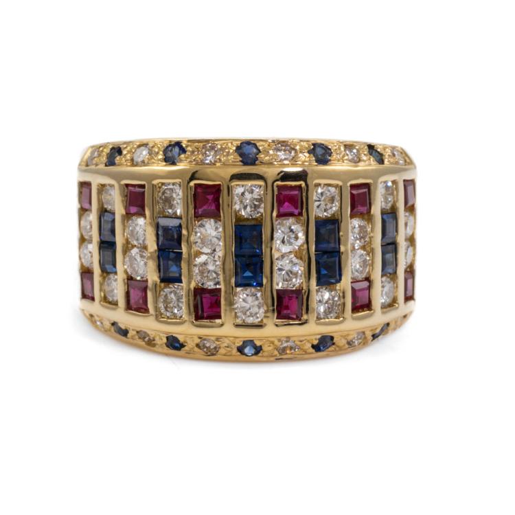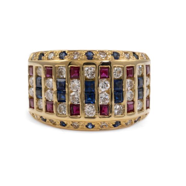 Sapphire, Ruby & Diamond ring with princess cut Natural Sapphires & Rubies totalling 1.39ct and round Natural Diamonds 0.81ct (Estimated grading: I-J SI). 18ct yellow gold. Ring size: N1/2. Band width: 5.10mm - 10.0mm. Weight: 10.1g. (Pre-owned)