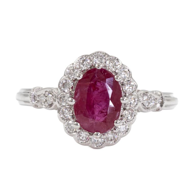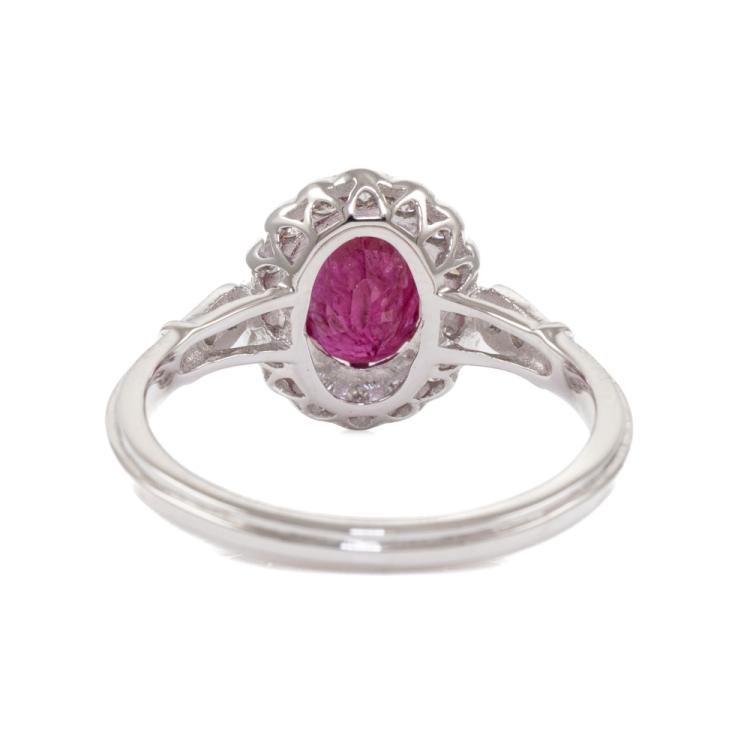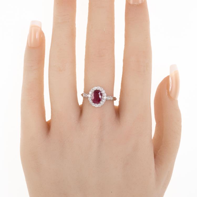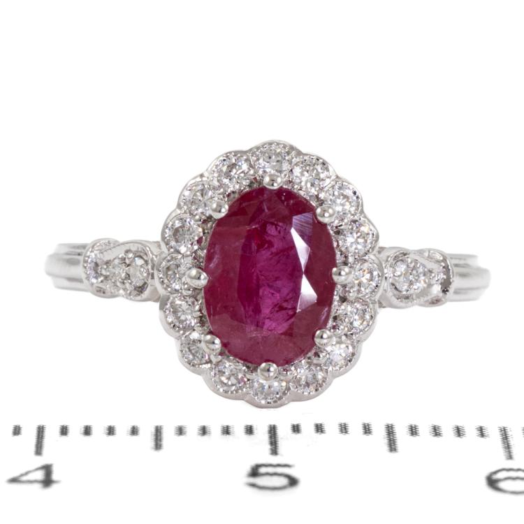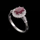 Ruby and Diamond ring with oval shape Natural Burmese Ruby of 1.48ct (With GSL Gemstone Summary Report #AA68792/1) and round Natural Diamonds totalling 0.36ct (Estimated grading: G-H VS). 18ct white gold. Ring size N. Band width: 2.0mm - 2.2mm. Weight: 3.3g. (As new)