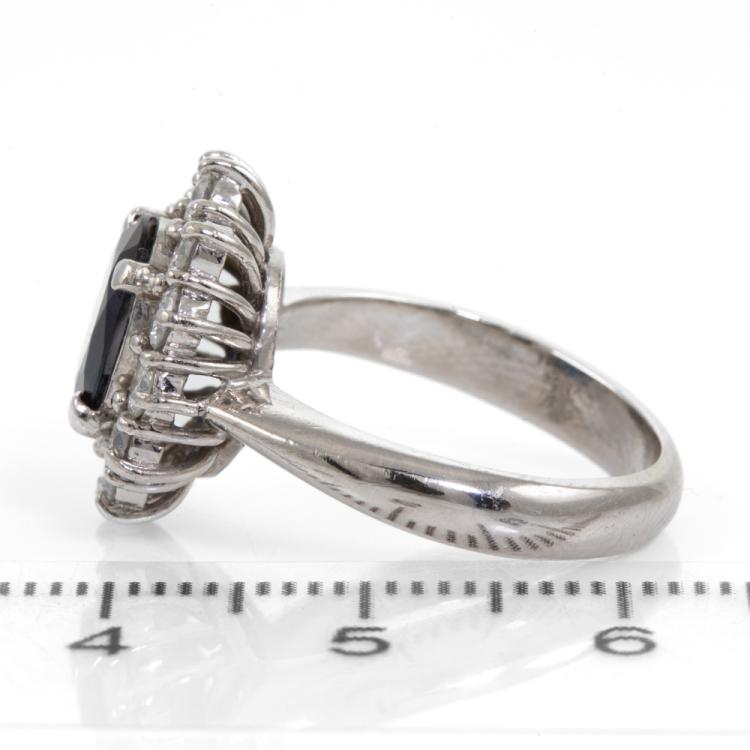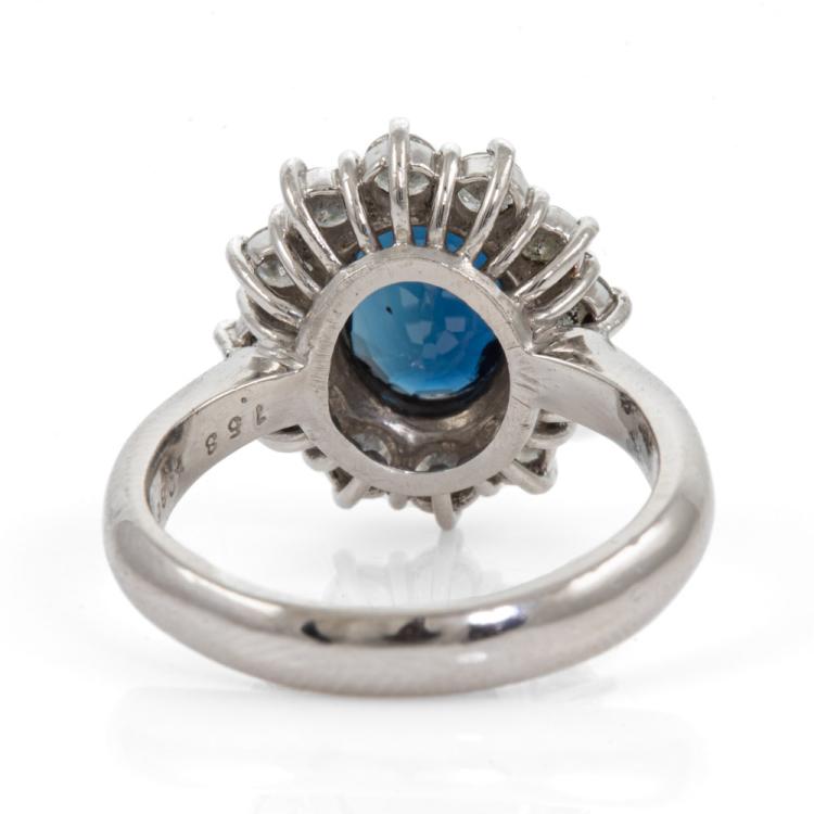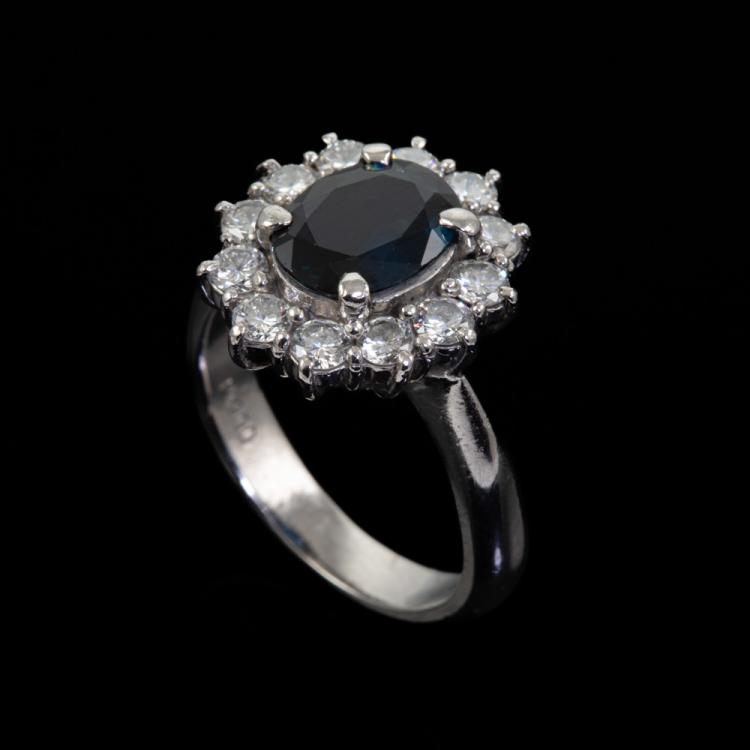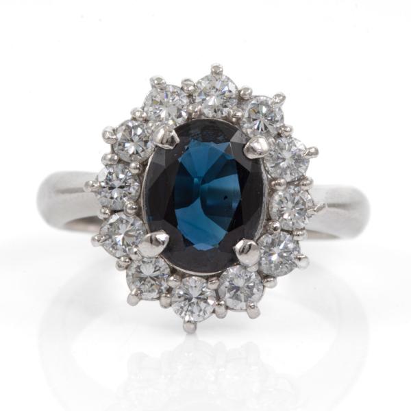 Sapphire and Diamond ring with oval shape Natural blue Sapphire of 1.58ct and Natural Diamonds totalling 0.86ct (Estimated grading: G- H VS-SI). Platinum 900. Ring size L. Band width: 3.25mm - 3.38mm. Weight: 8.6g. (Pre-owned)