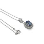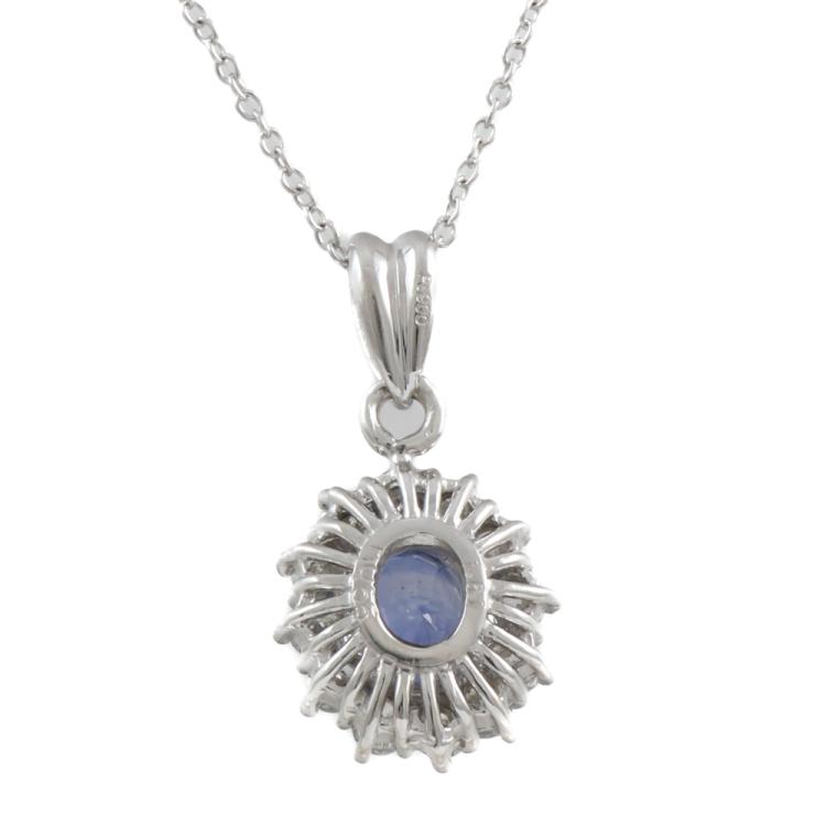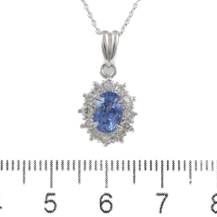 Sapphire and Diamond pendant with oval shape blue Natural Sapphire of 1.61ct and round Natural Diamonds totalling 0.55ct (Estimated Grading: G-H P1). Platinum - 900 with 18ct white gold 40.0cm chain. Weight: 4.5g. (Pre-owned)