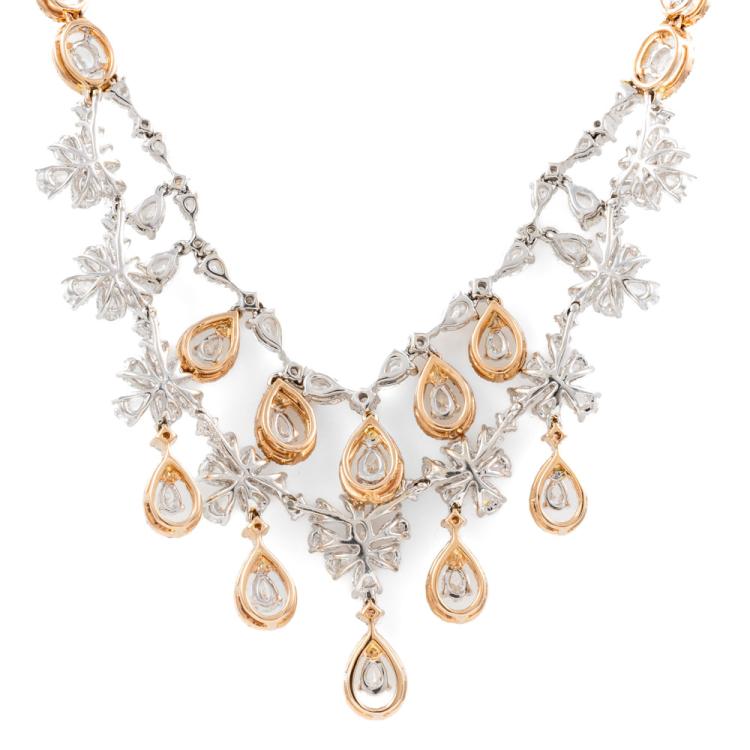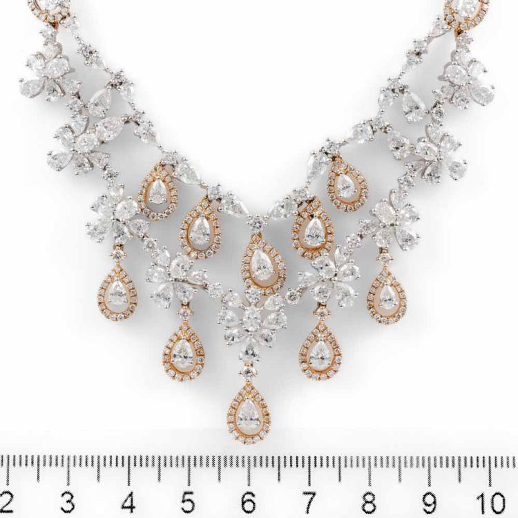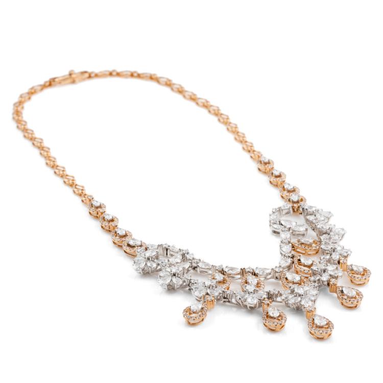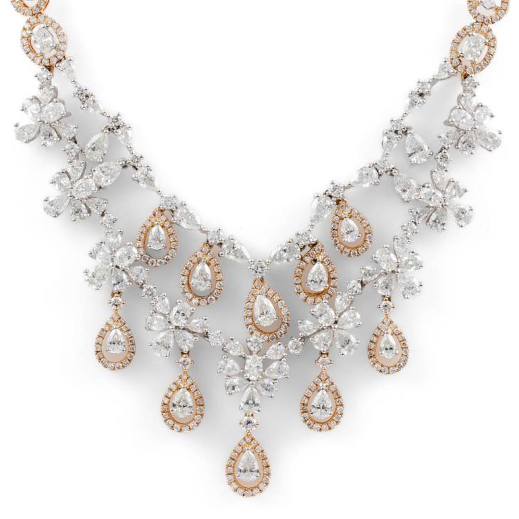 Diamond chandelier necklace with round, oval & pear shape Natural Diamonds totalling 16.34ct (Estimated grading: H-J SI). 18ct white and rose gold. Length: 40cm. Weight: 44.4g. With Certificate 418124. (Pre-owned)