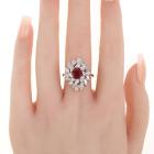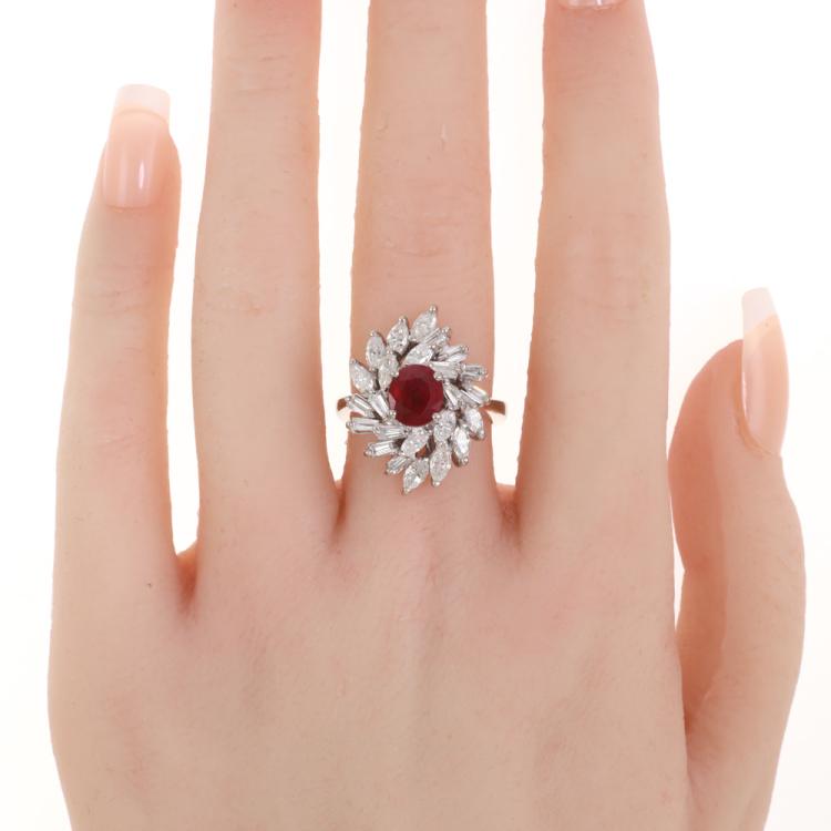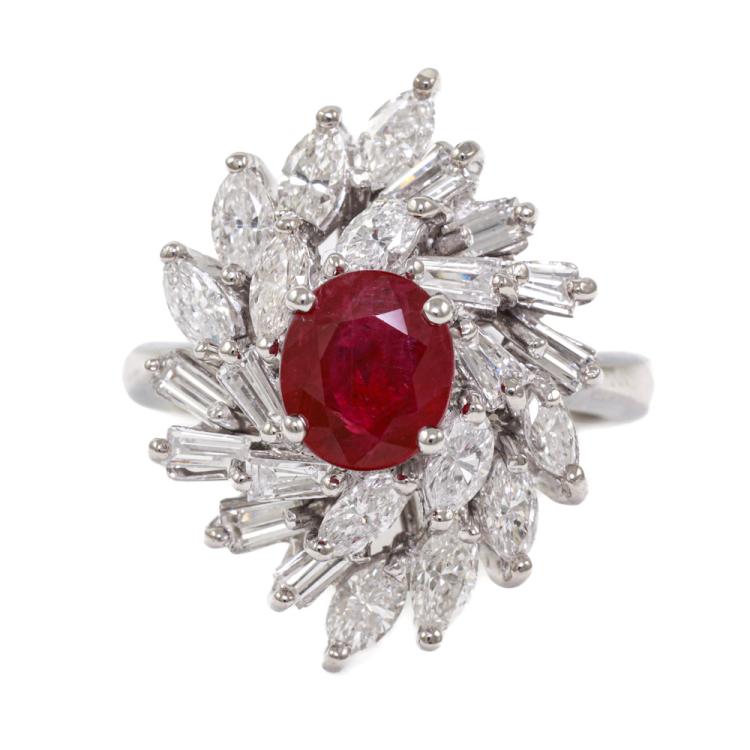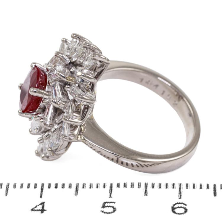 Ruby and Diamond ring with oval Natural Ruby totalling of 1.64ct and marquise & baguette cut Natural Diamonds totalling 1.92ct (Estimated grading: G-H SI). Platinum-900. Ring size: L1/2. Band width: 3.4mm - 1.8mm. Weight: 12.4g. (Pre-owned)